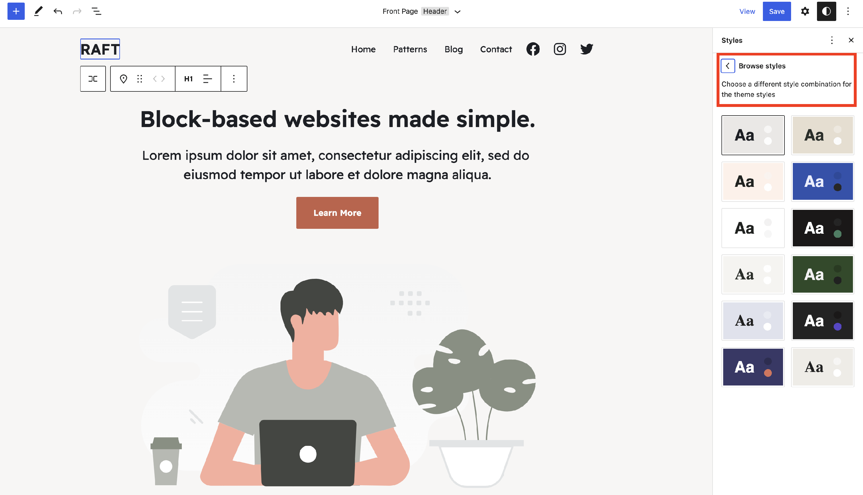 From there, you can choose to browse styles which will change the appearance of your website completely, according to the selected palette: