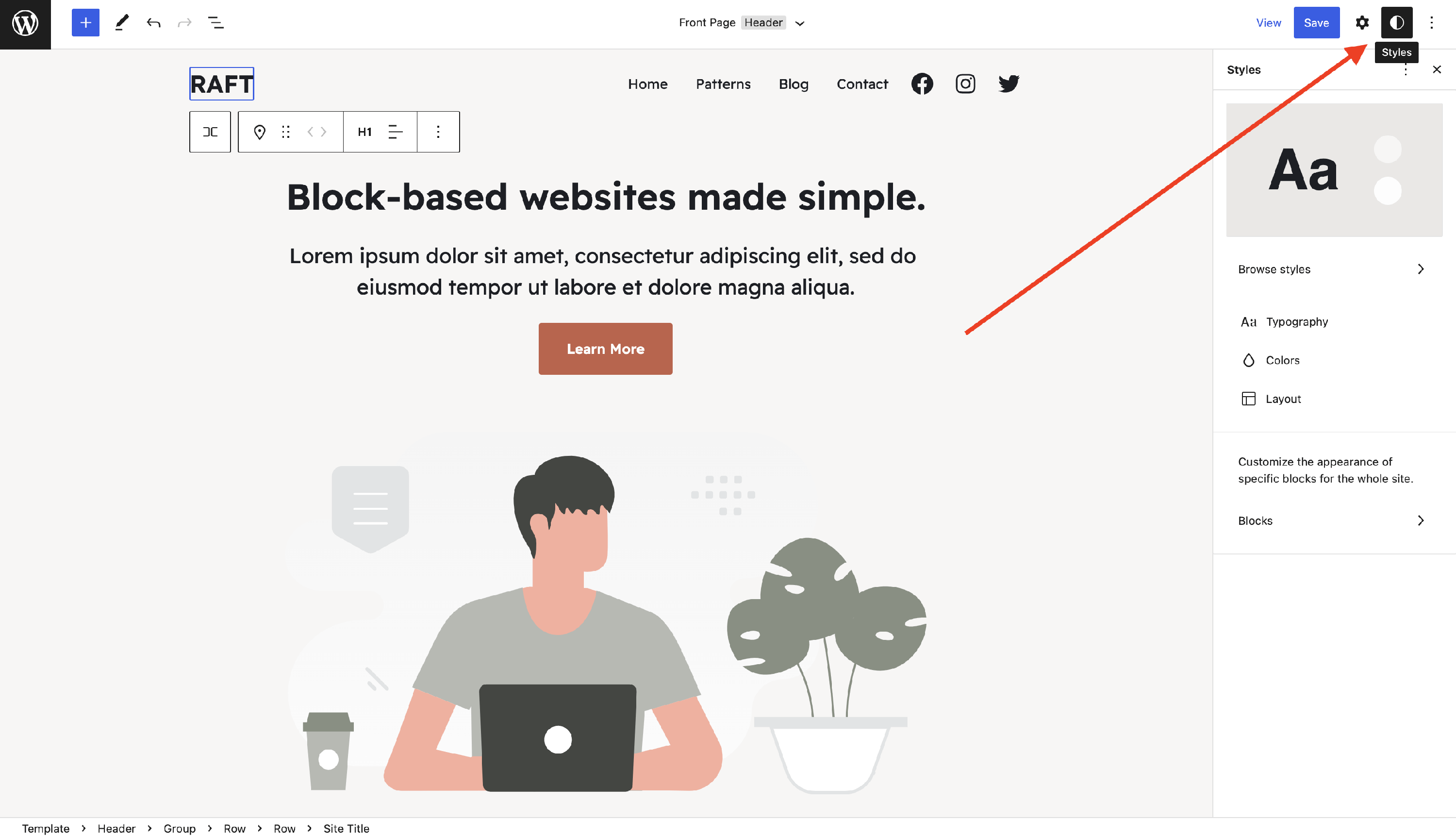 To reach the Styles panel, navigate to Appearance > Editor and click the Styles icon.