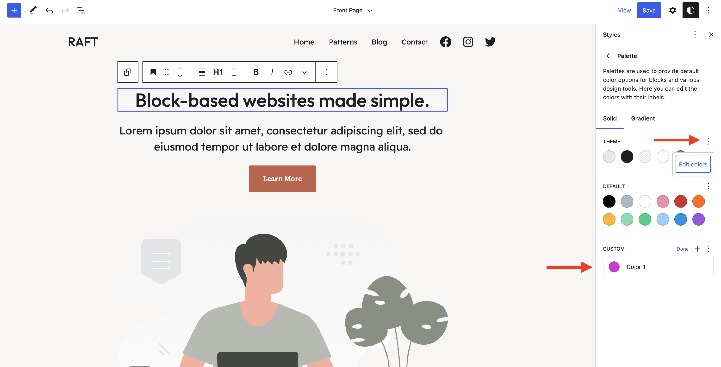 The colors from the Theme section will appear across the theme's settings, whereas those from the Default section can be used for the blocks.