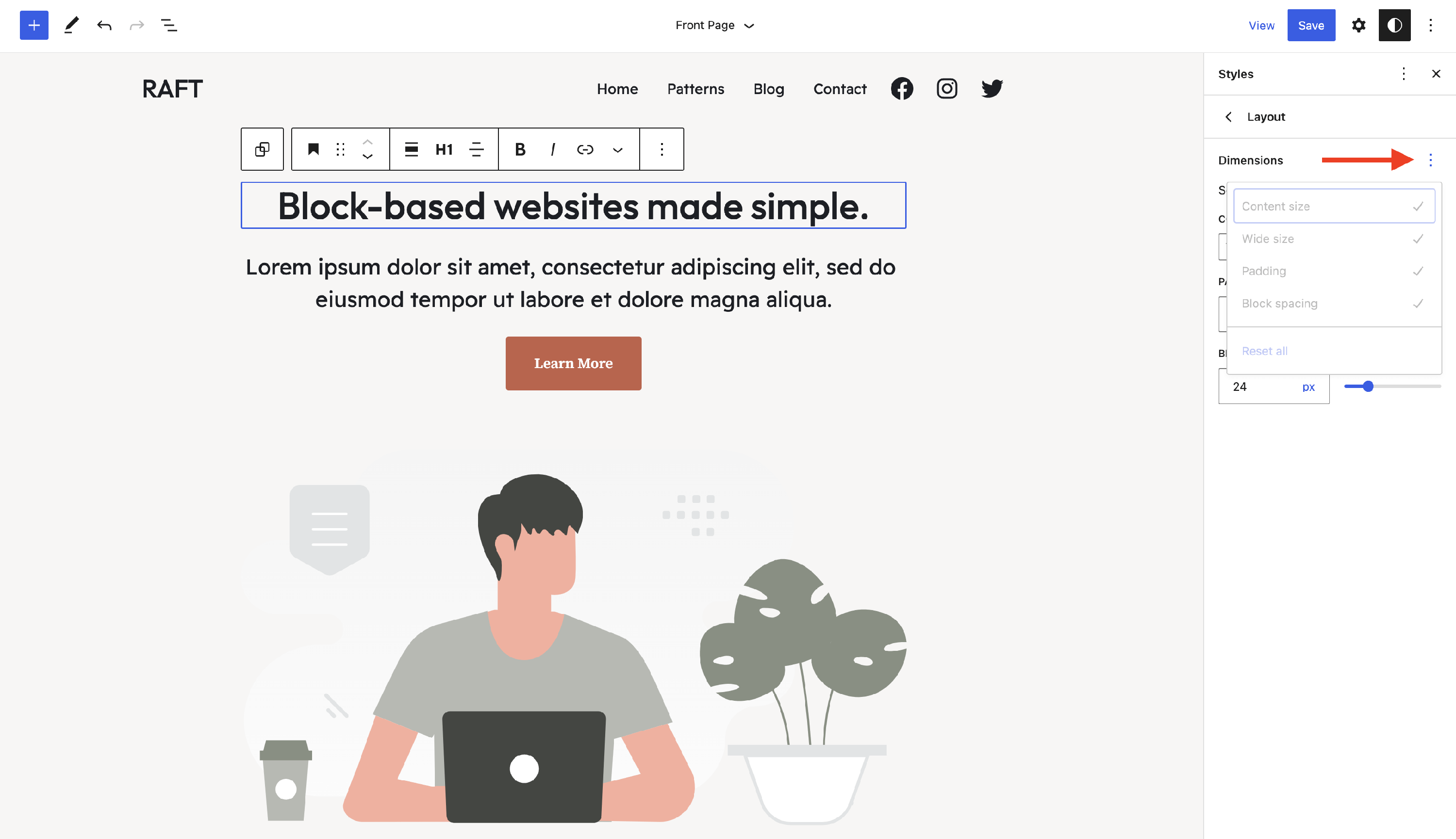 In the layout section, you can set the width of the main content area. Clicking on the three dots allows you to enable other dimensions, such as padding or block spacing: