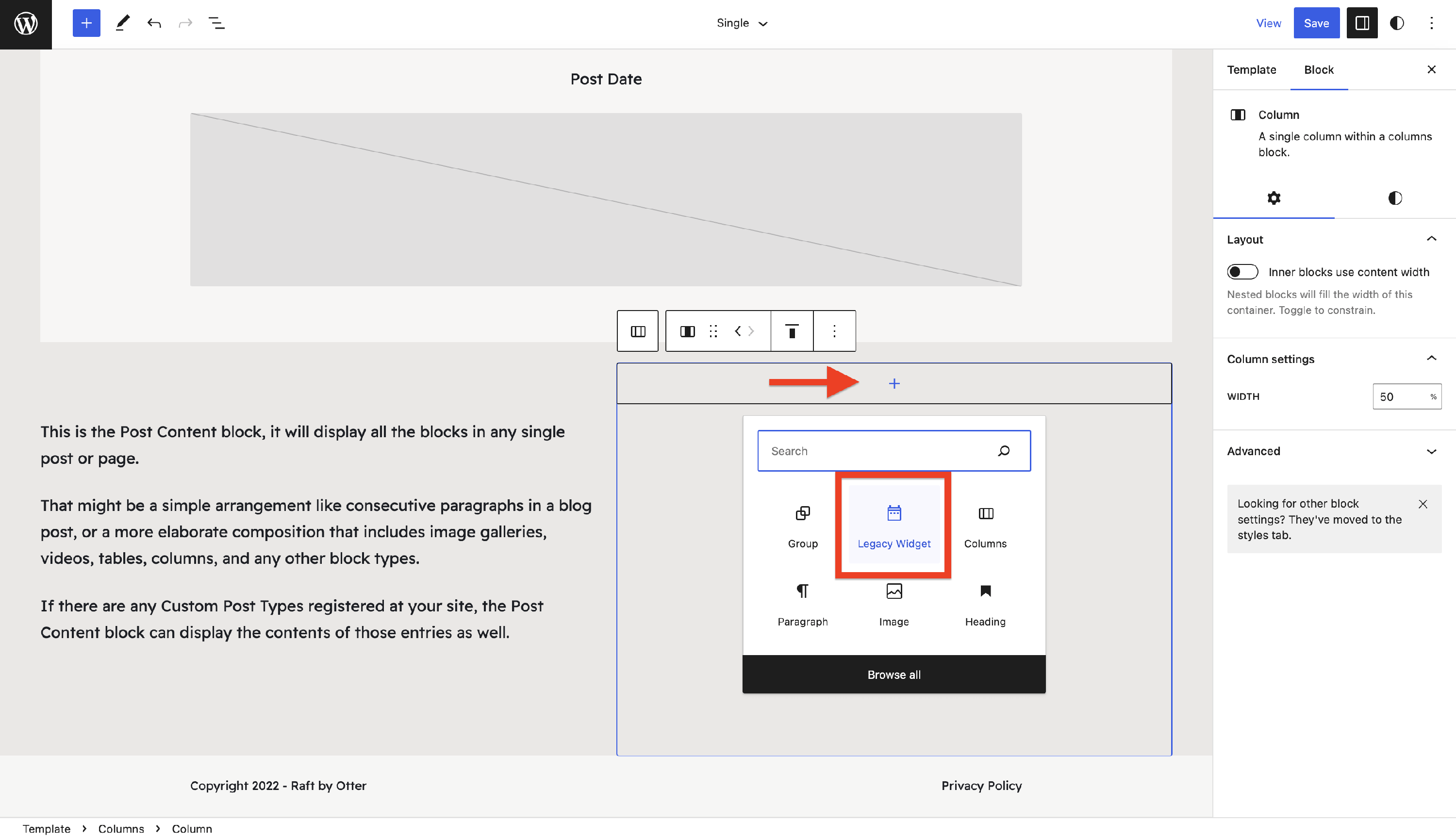 6 In the second column, insert the Legacy Widget block.