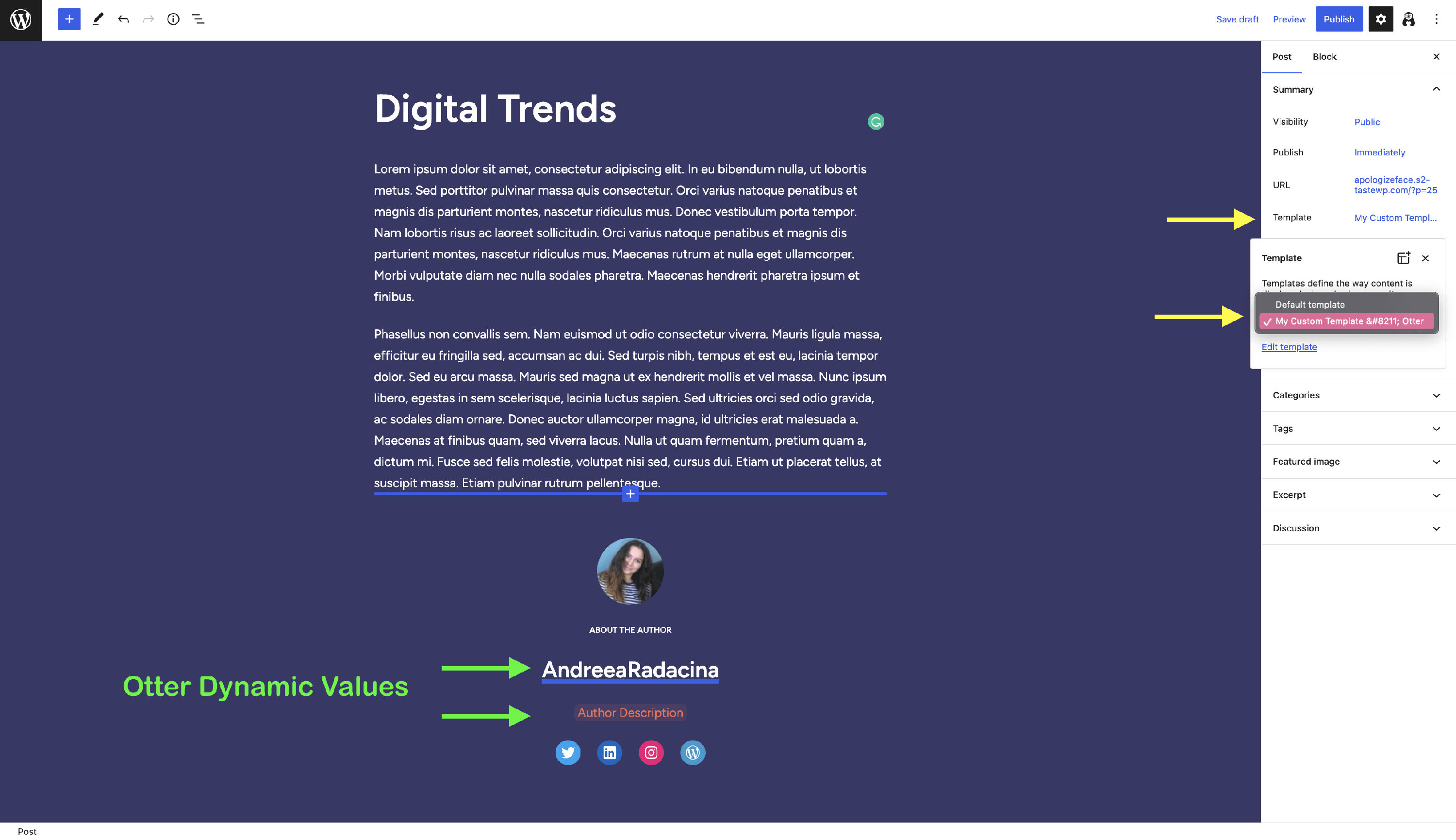 Here you can insert Otter blocks, as you would for regular pages, or use Otter dynamic values to import content automatically.