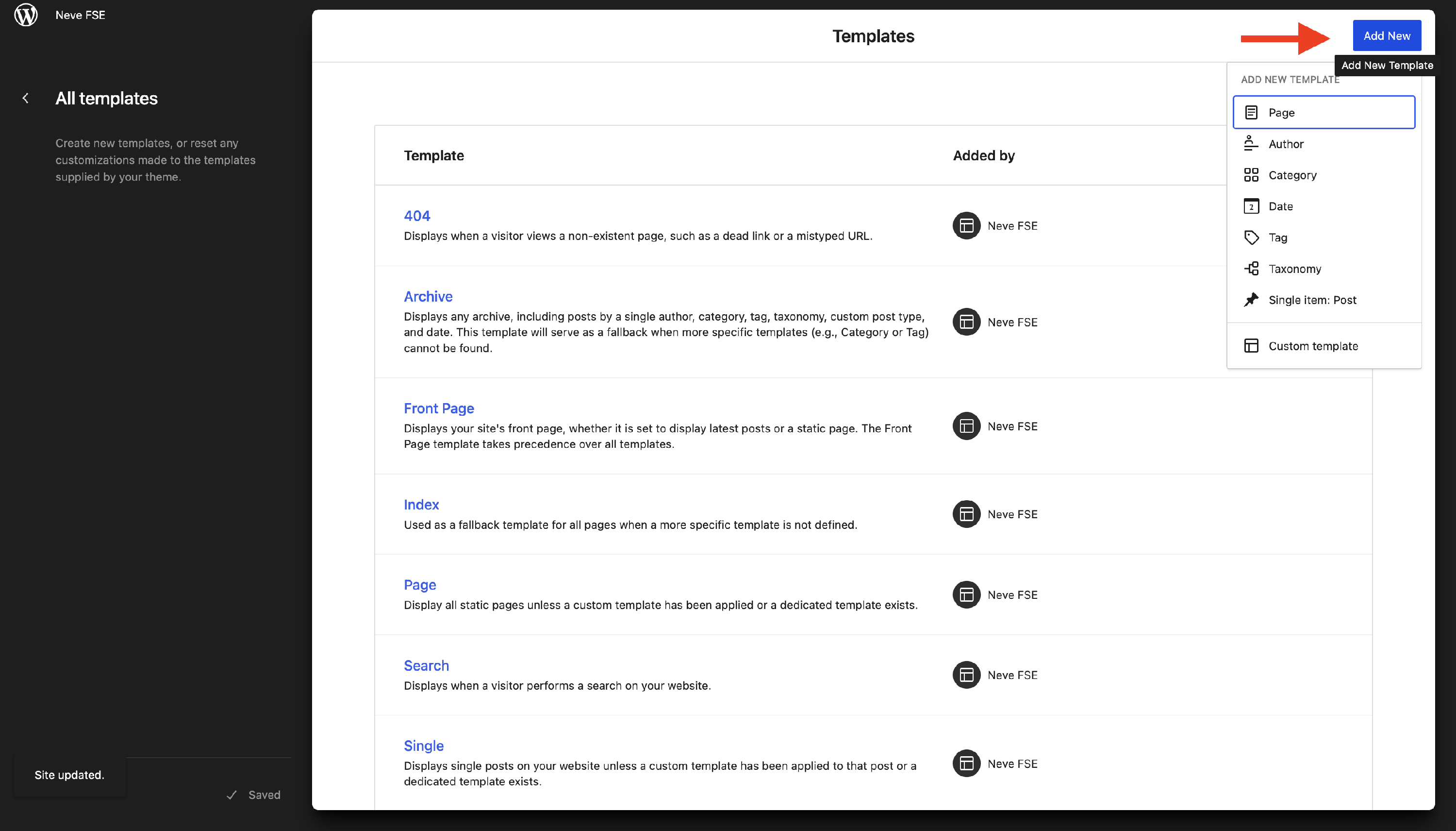 From there, you can access the Templates or Template Parts and edit them by clicking on the pencil button.