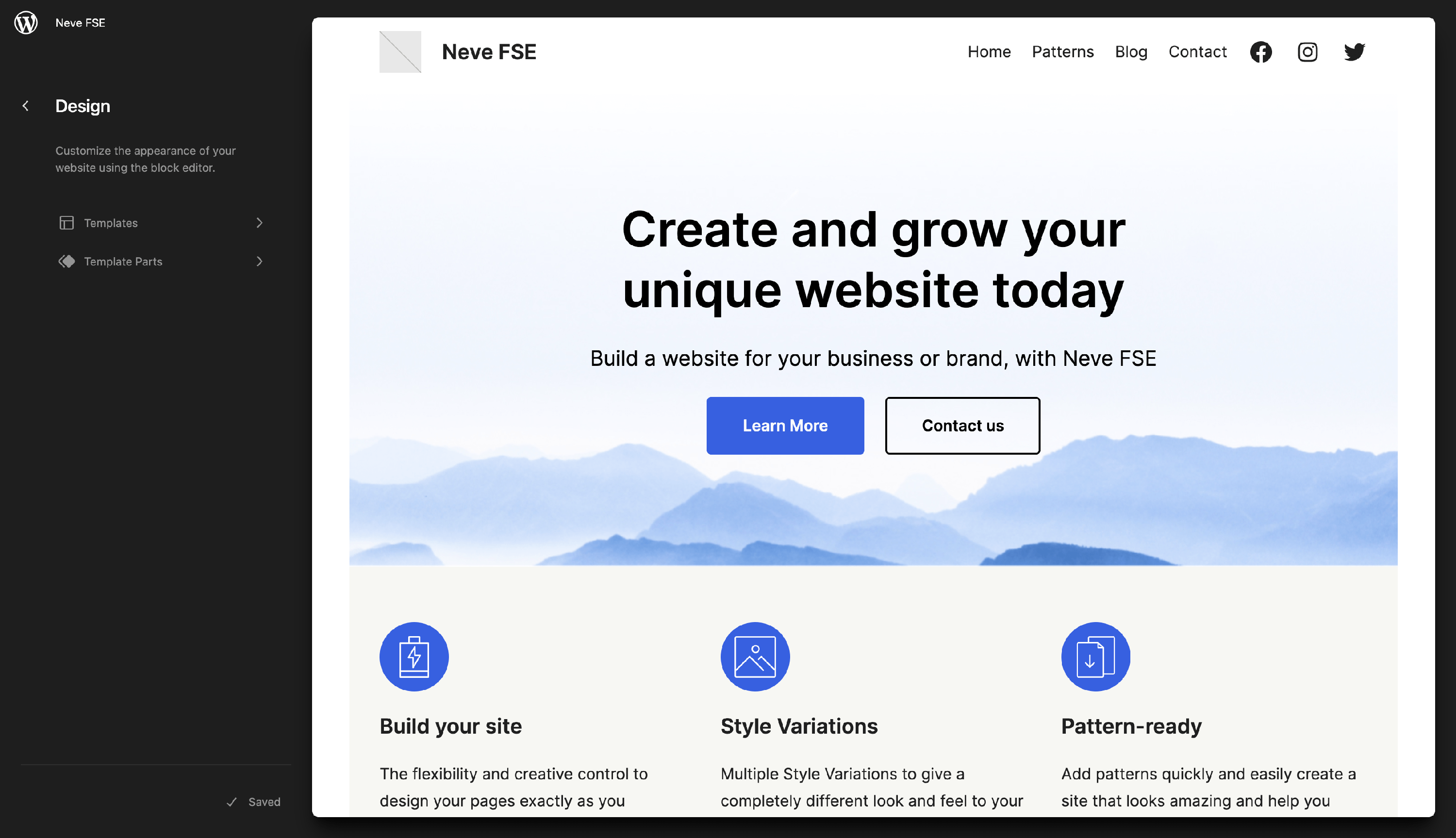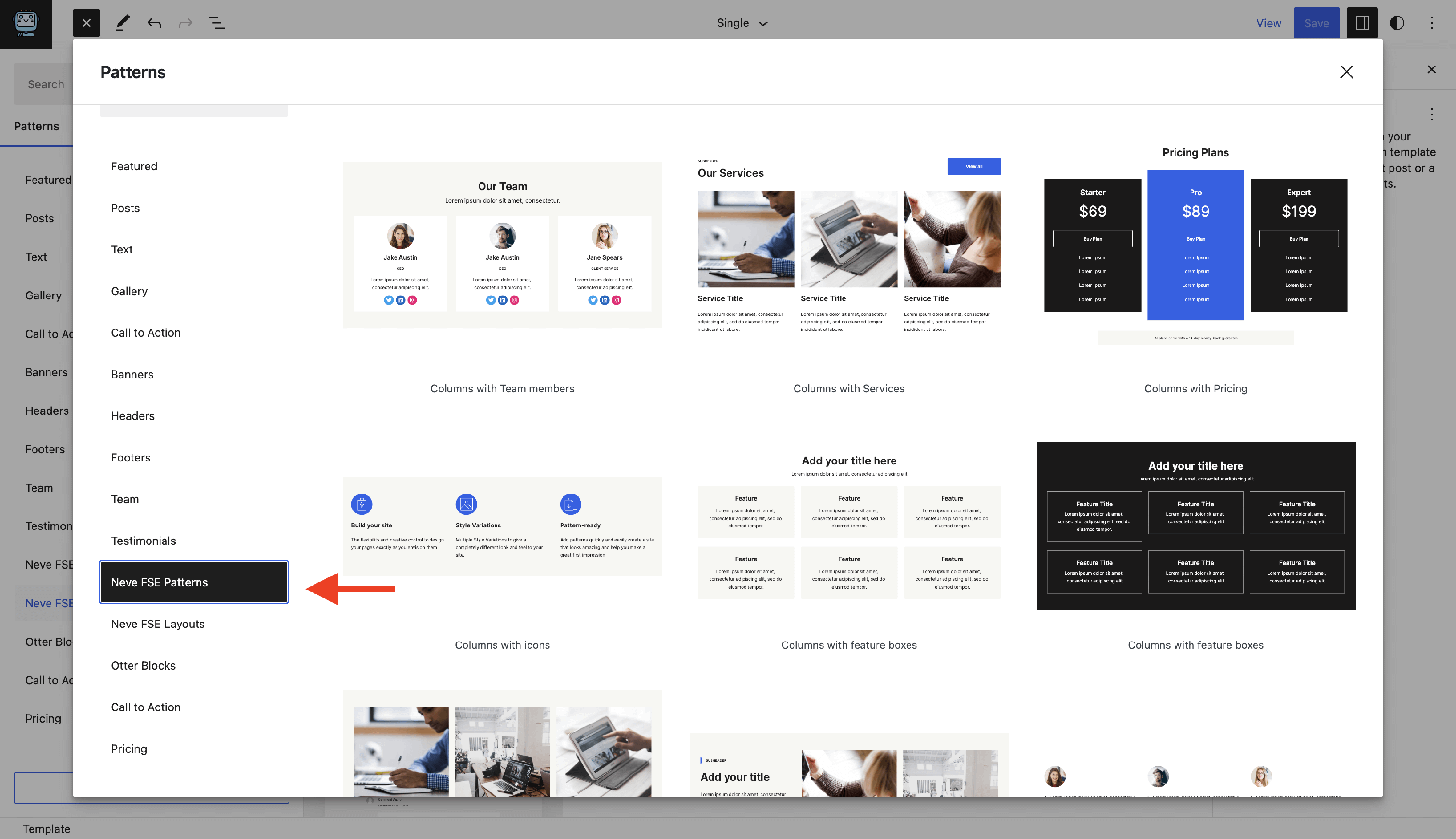 The professionally designed patterns that Neve FSE offers will help you enhance your website's appearance. There you can find call-to-action sections, columns with images and content, page covers, team sections, services, pricing plans, and many more.
