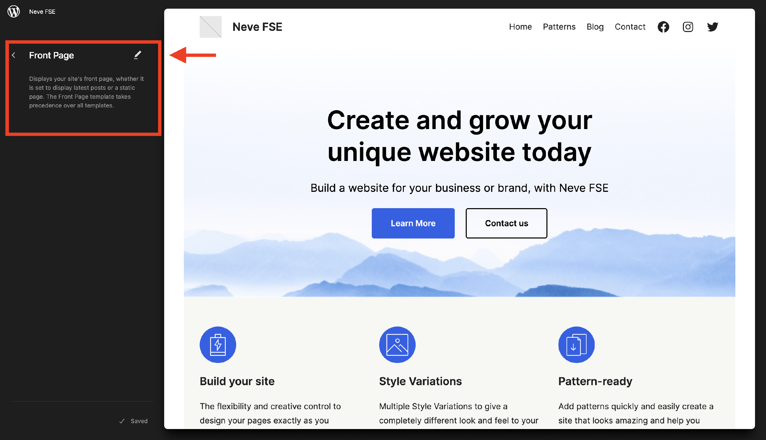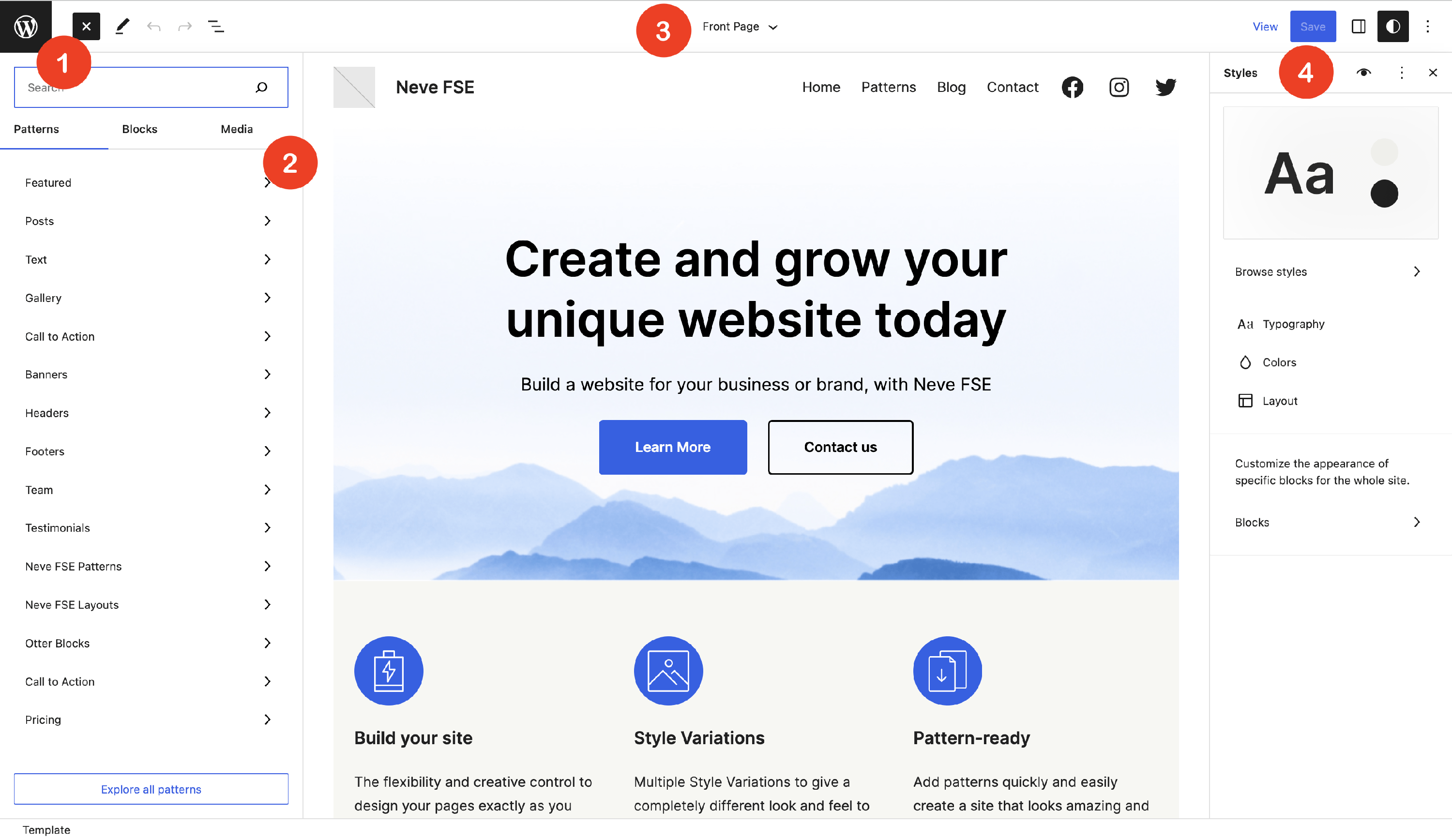 - 2 = patterns/blocks library - take advantage of the ready-made Neve FSE patterns or use the blocks to create the desired website.