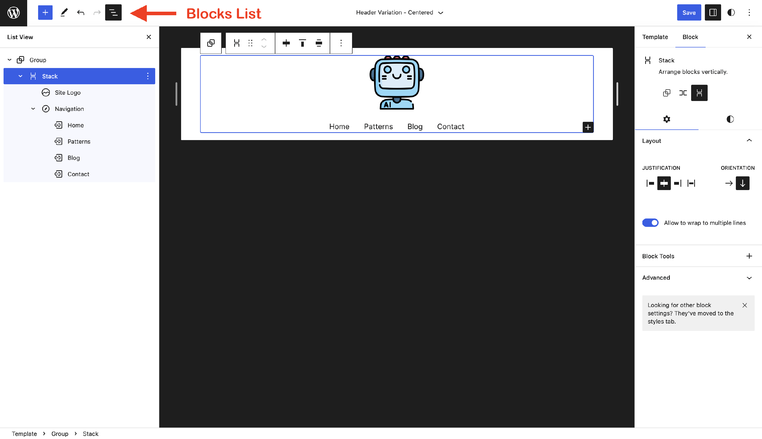 - 1 = site icon (or WordPress icon) - opens the left sidebar allowing you to return to the dashboard or to switch to templates or template parts.