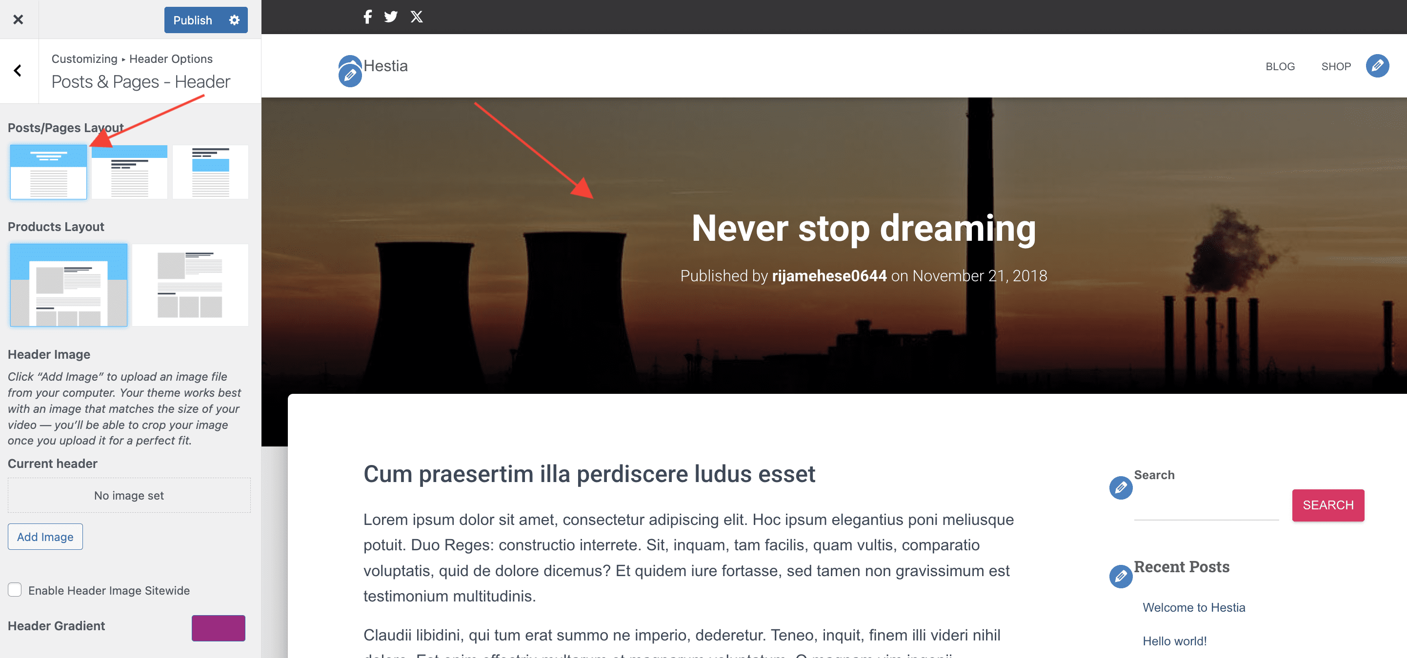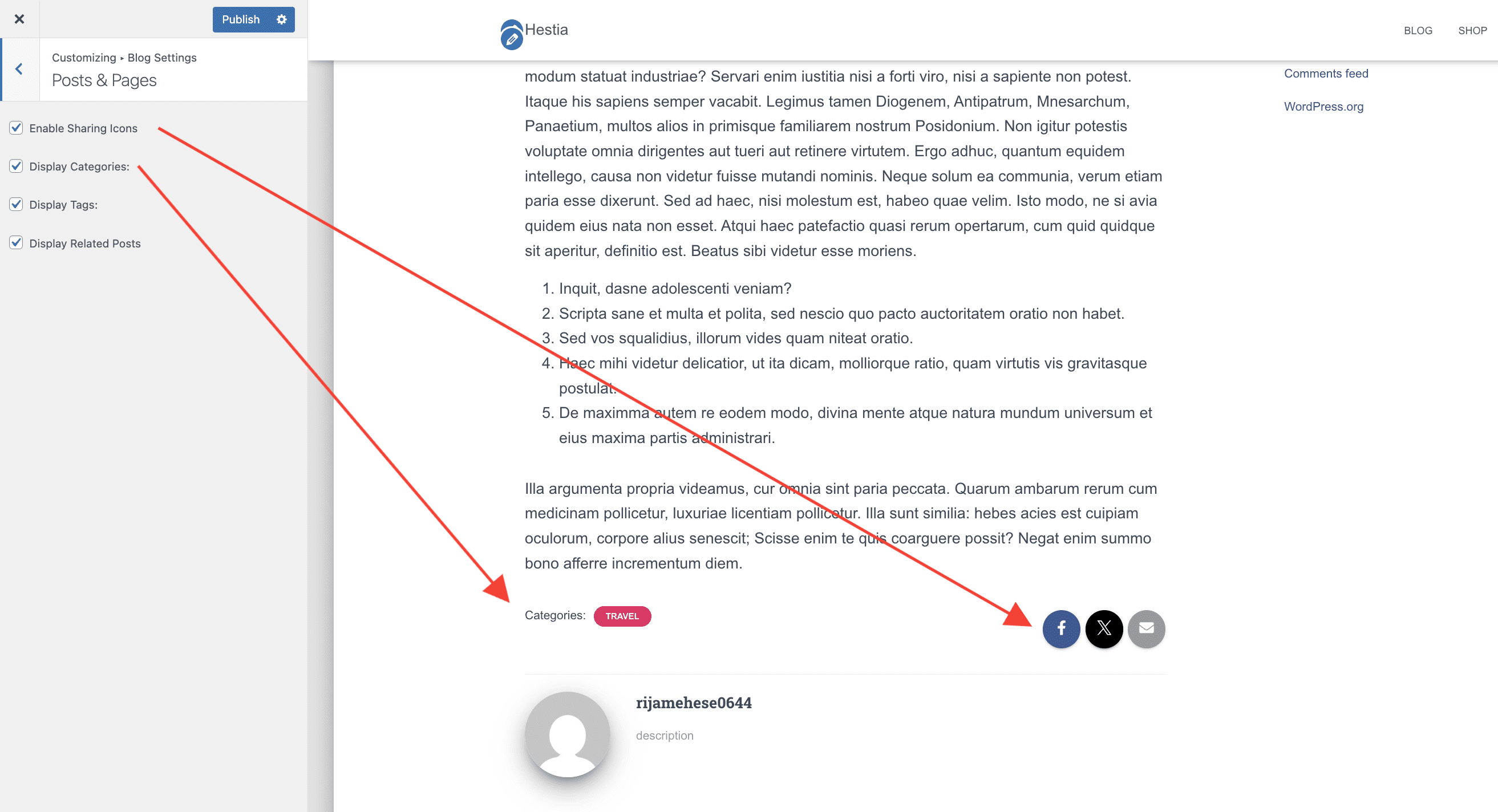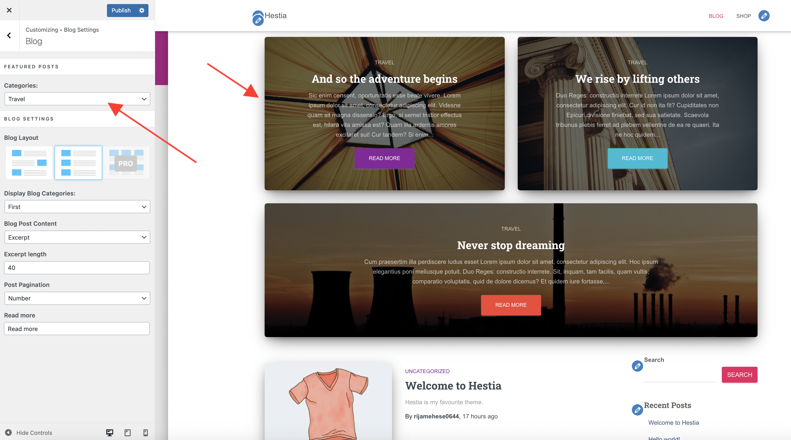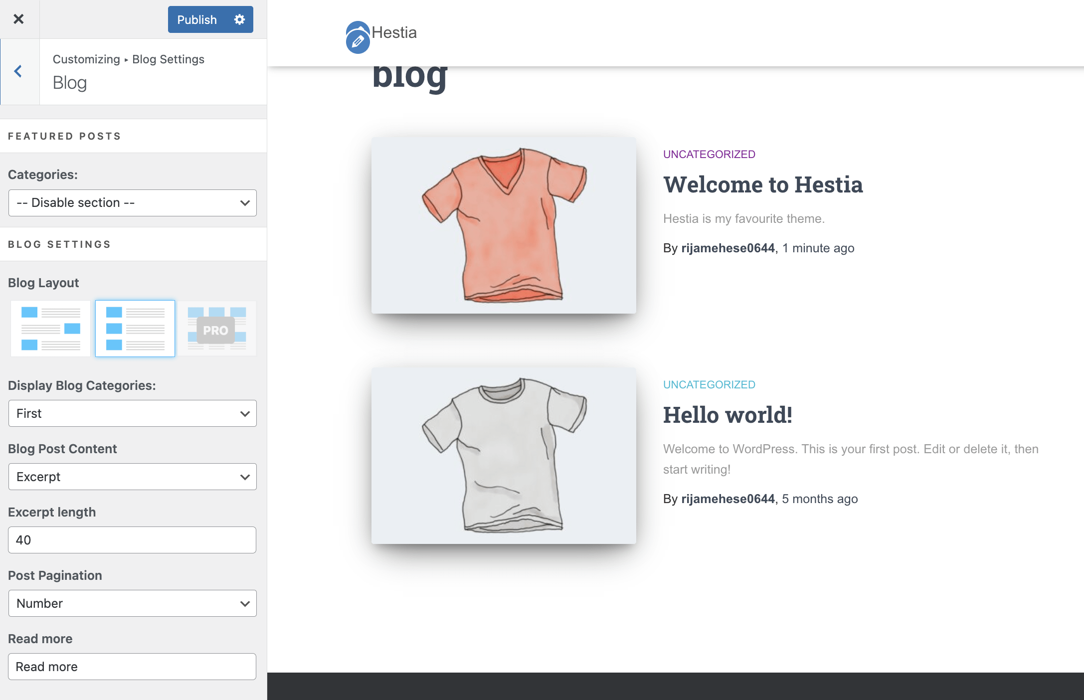 📝 Note: More options, such as grid layout, author section, and subscribe section are available in Hestia Pro, which you can get from here.