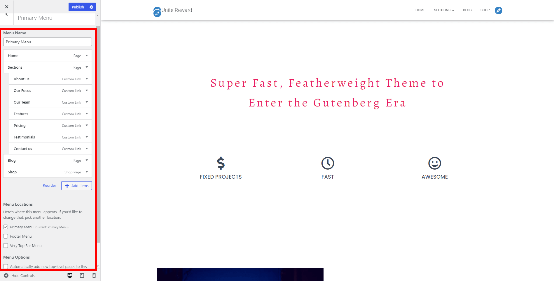 In this panel, you have the possibility to configure your current menu, create a new one or set the menu locations. Hestia supports three menus: Primary Menu, Footer Menu, and the Very Top Bar Menu.