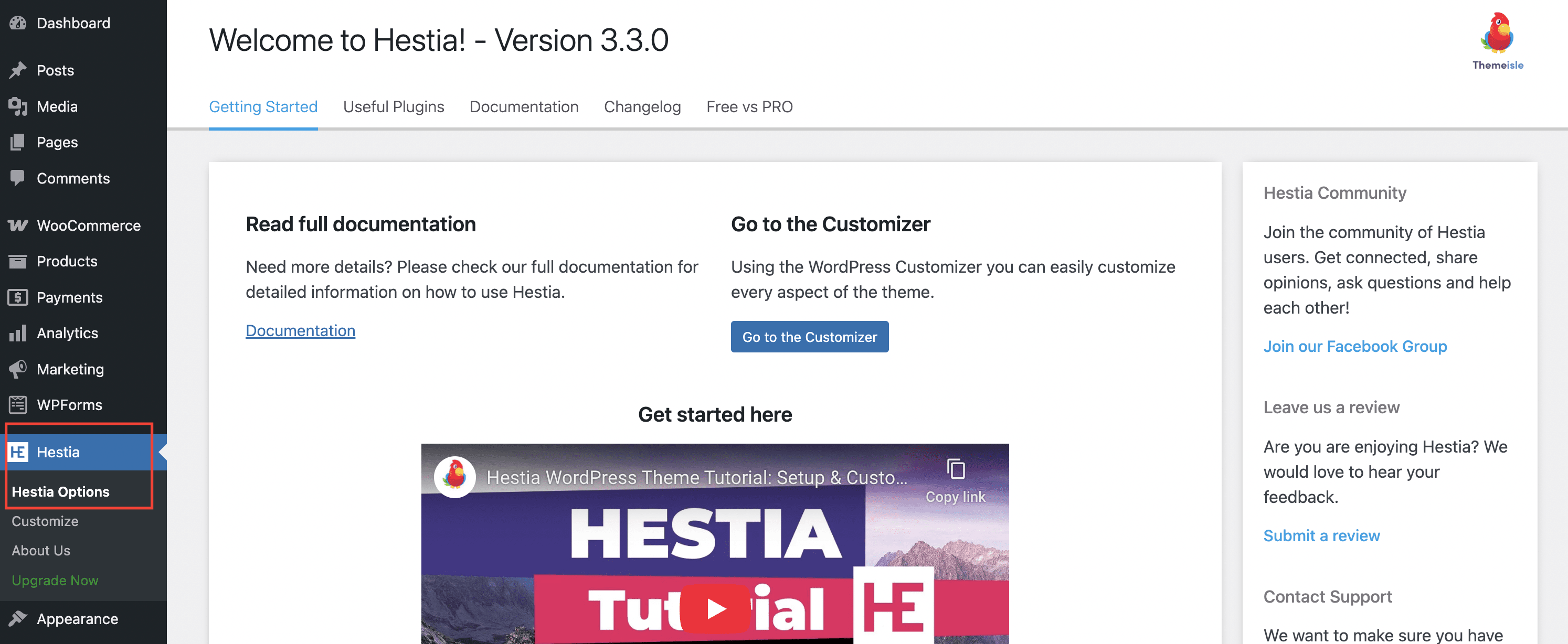 Here you will find information that will help you get started with Hestia, such as recommended actions, useful plugins that will enhance your experience, support information, a changelog with the latest updates, and a free vs pro table.