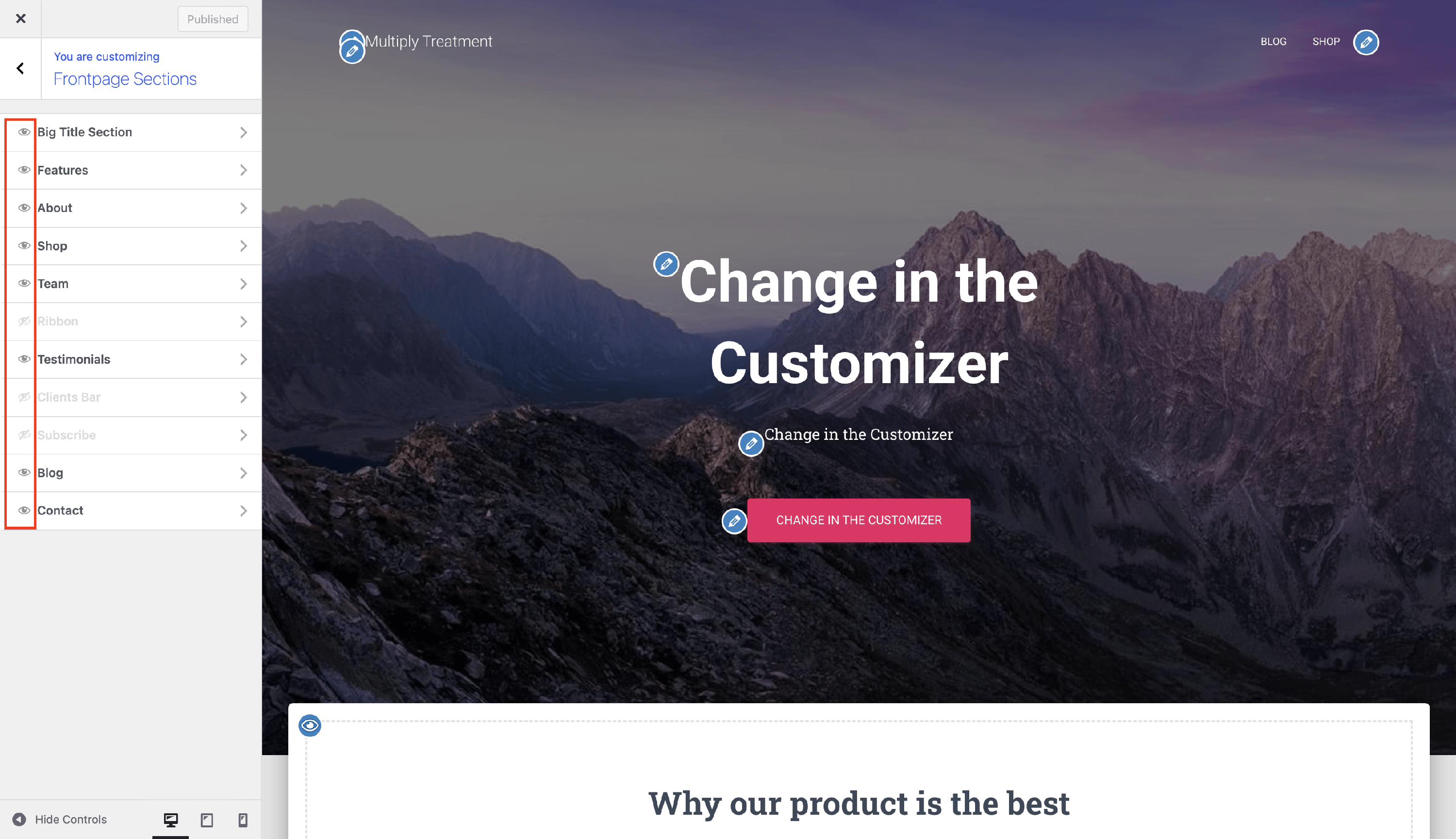 Visibility - you can turn on / off the visibility of the elements, by clicking the 👁️ button. This can also be done while accessing a certain section, by clicking on the Disable section button. The PRO version allows you also to reorder the frontpage sections.