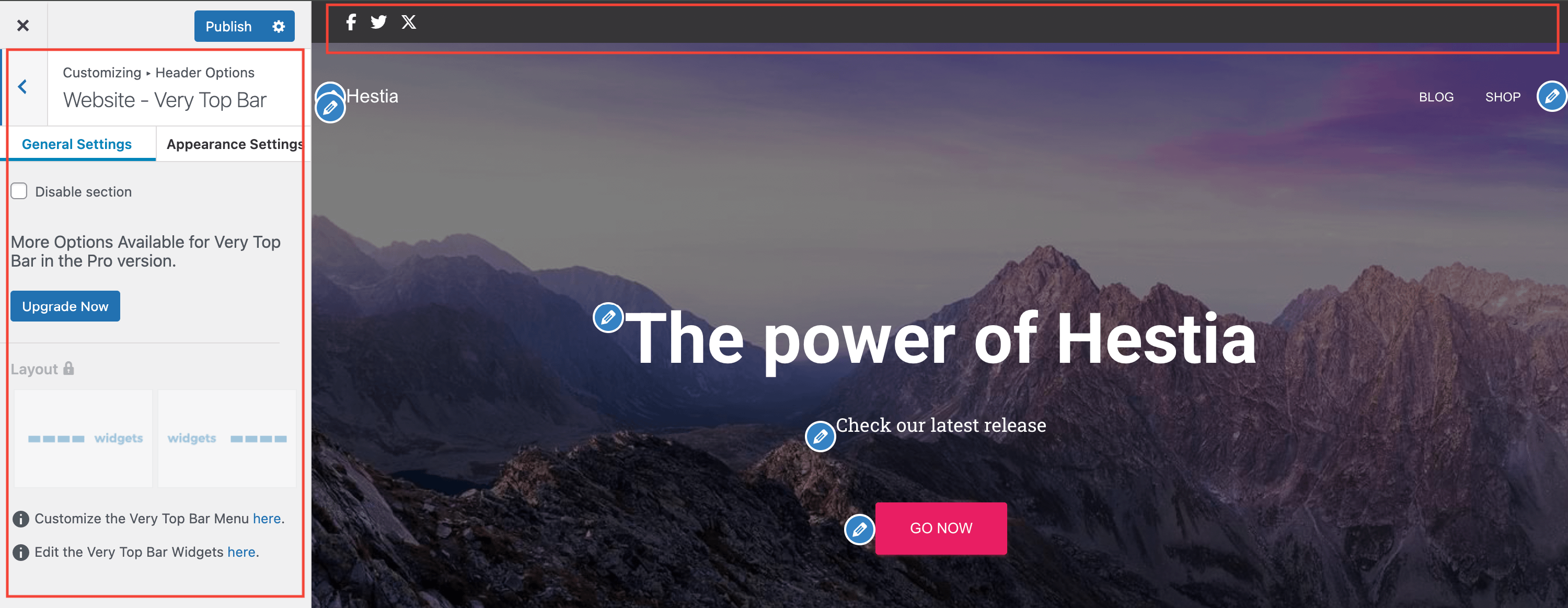 📝 Note: Hestia Pro allows you to set a distinct layout for the very top bar. Also, it has a second panel called Appearance Settings, which allows you to adjust the background, text, link, and link on hover colors.