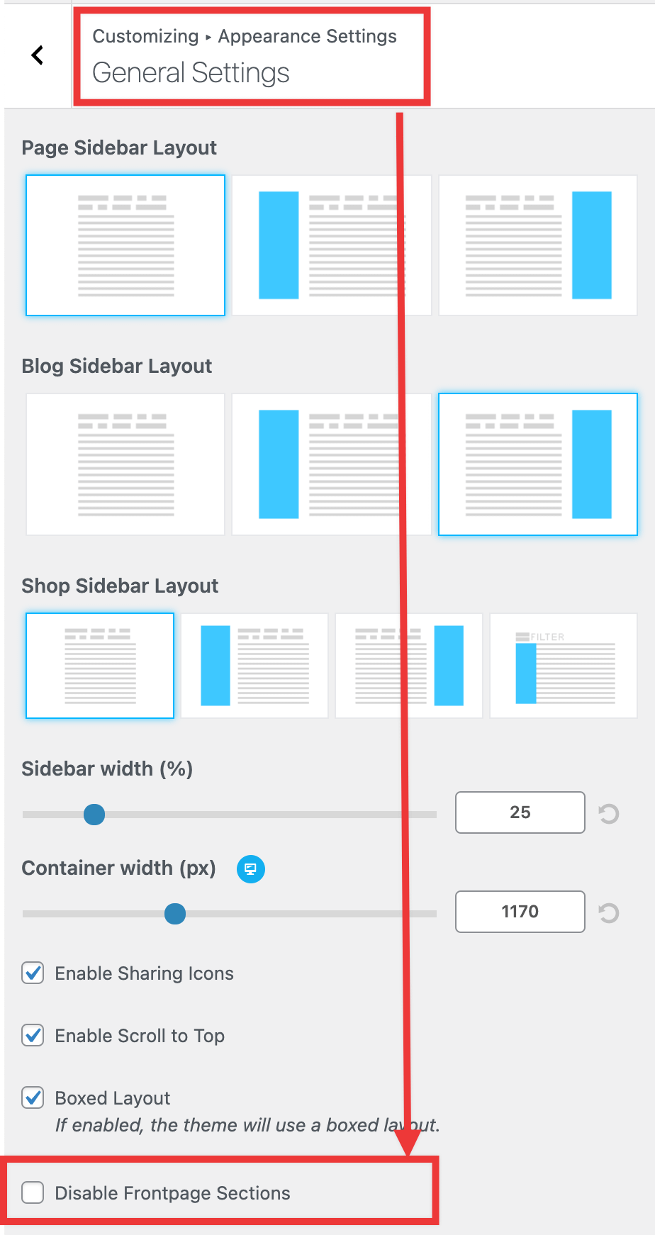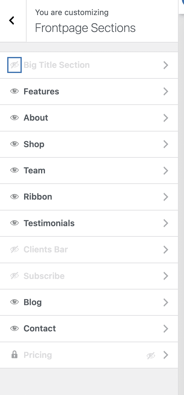 Note: Each frontpage section can be enabled/disabled by clicking on the little eye icon, next to it.
