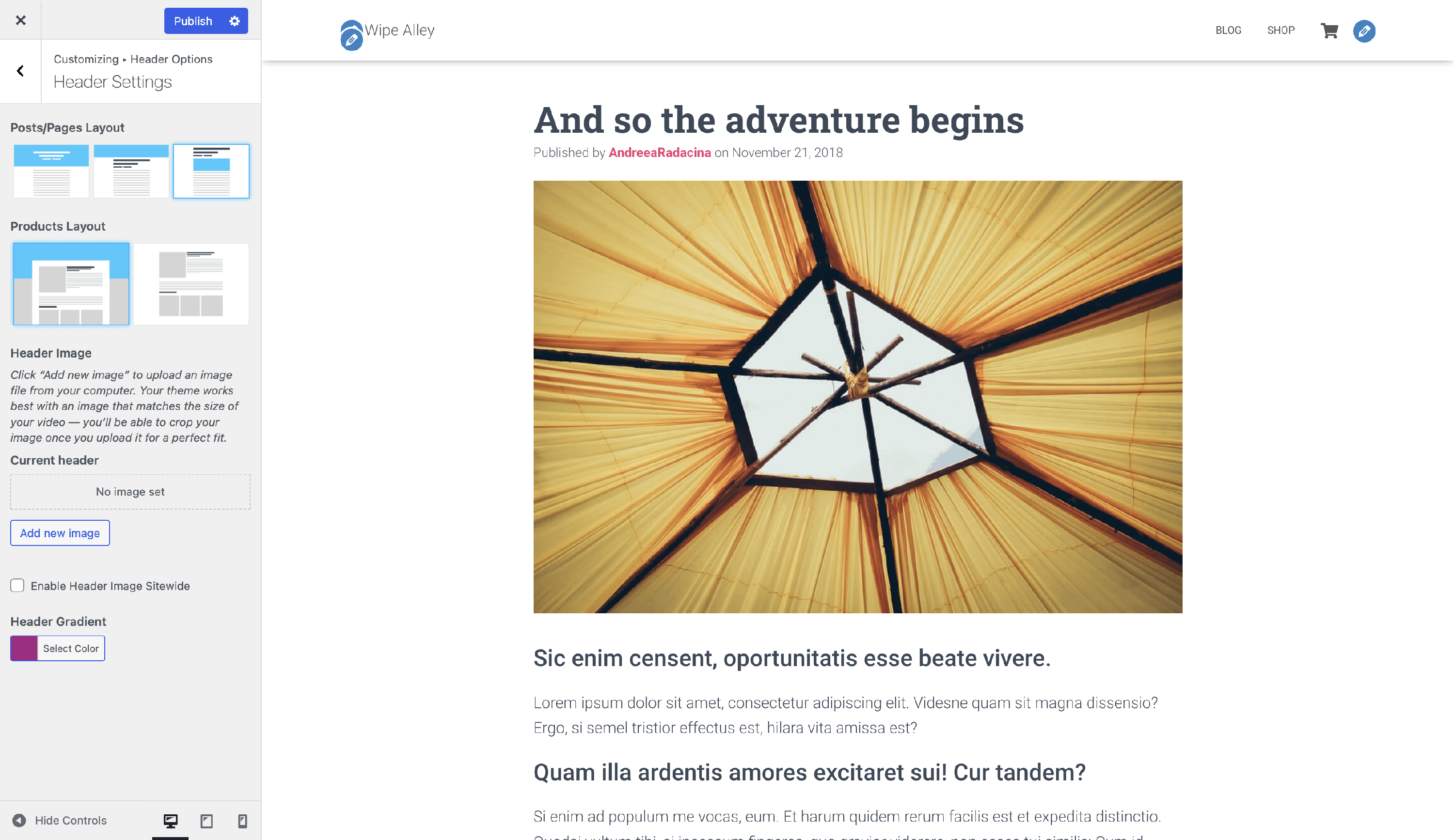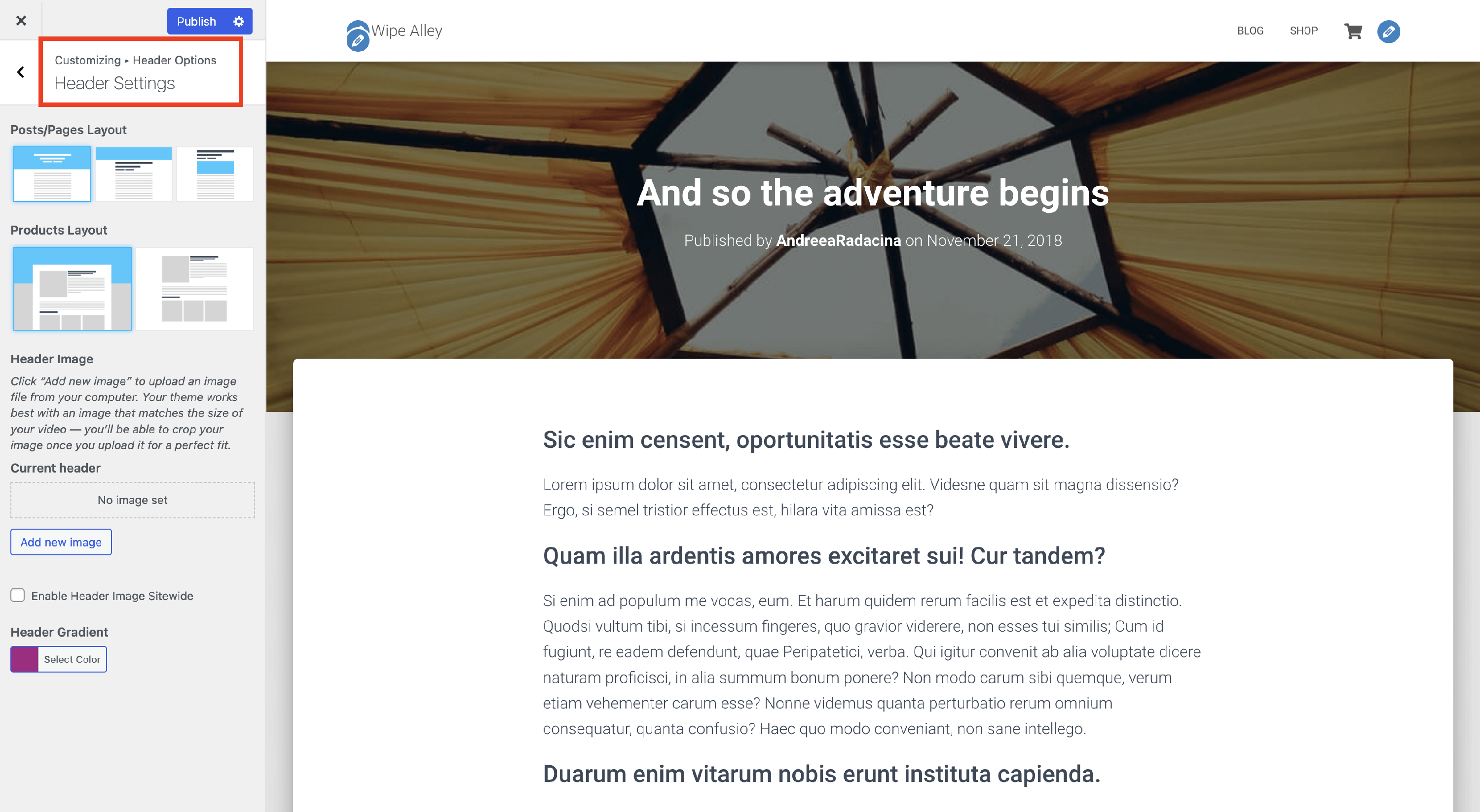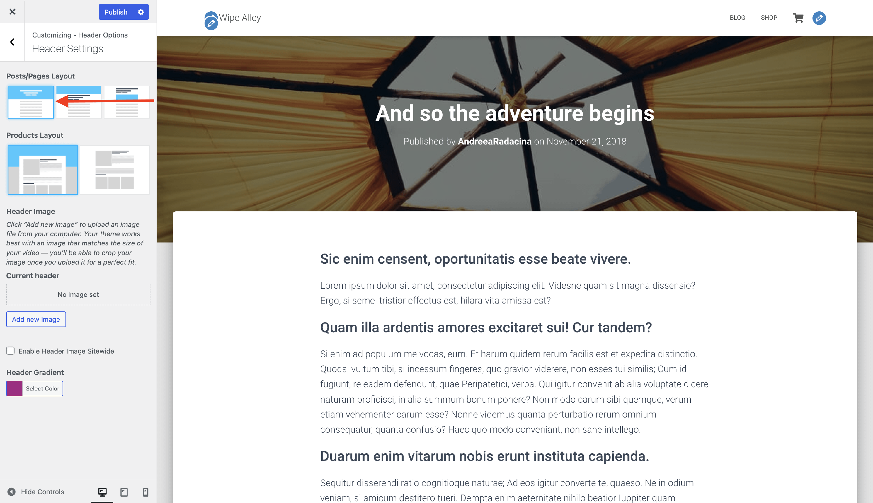 2 Inside the editor, on the Page settings, move to Header Layout.