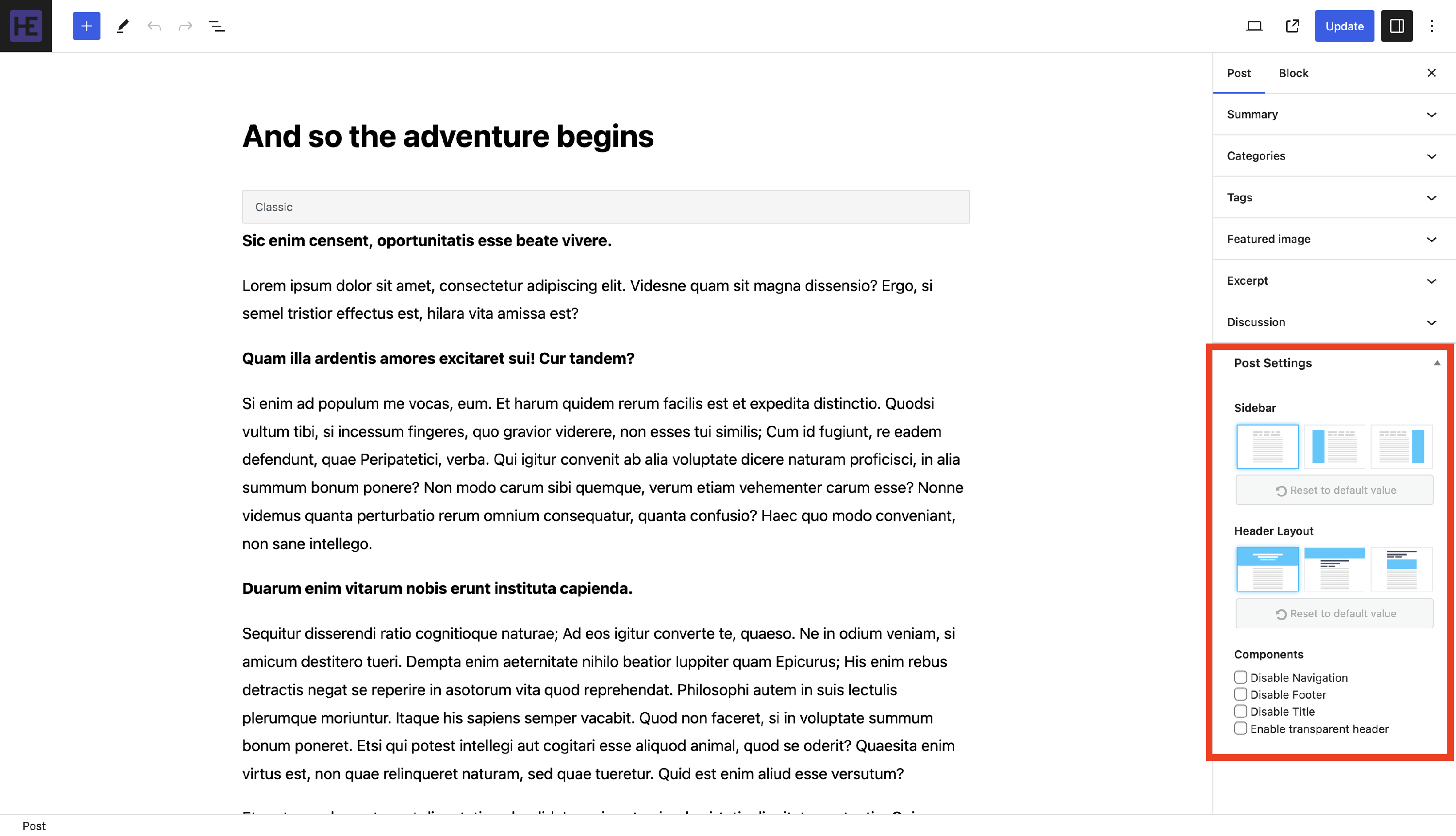 Apart from the sidebar position and header layout, the individual editor allows you to enable/disable components. This means that the particular page or post that you're currently editing can be different from the others. The available toggles are: