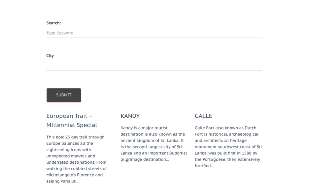 A custom search is handy on any website as it allows your visitors to use the advanced filters on a search form to narrow down the results. In our example, users can make use of filters like “Number of guests”, “City”, “Duration”, etc.
