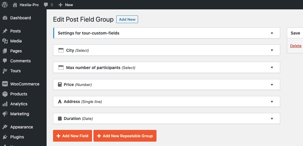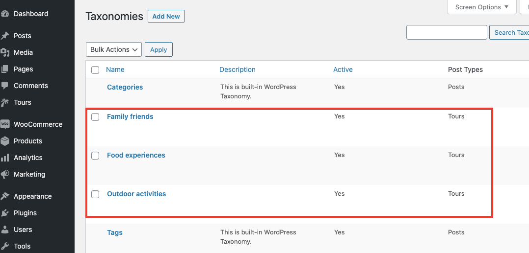 We created the CPT “Tours” that has some custom fields (City, Max number of participants, Duration, Price, Address) and custom taxonomies (Family friendly, Food experience, Outdoor activities, etc.).