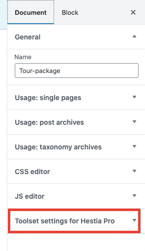 When creating a new template using Toolset for your custom post type or archive pages, you can control some of Hestia Pro theme options.