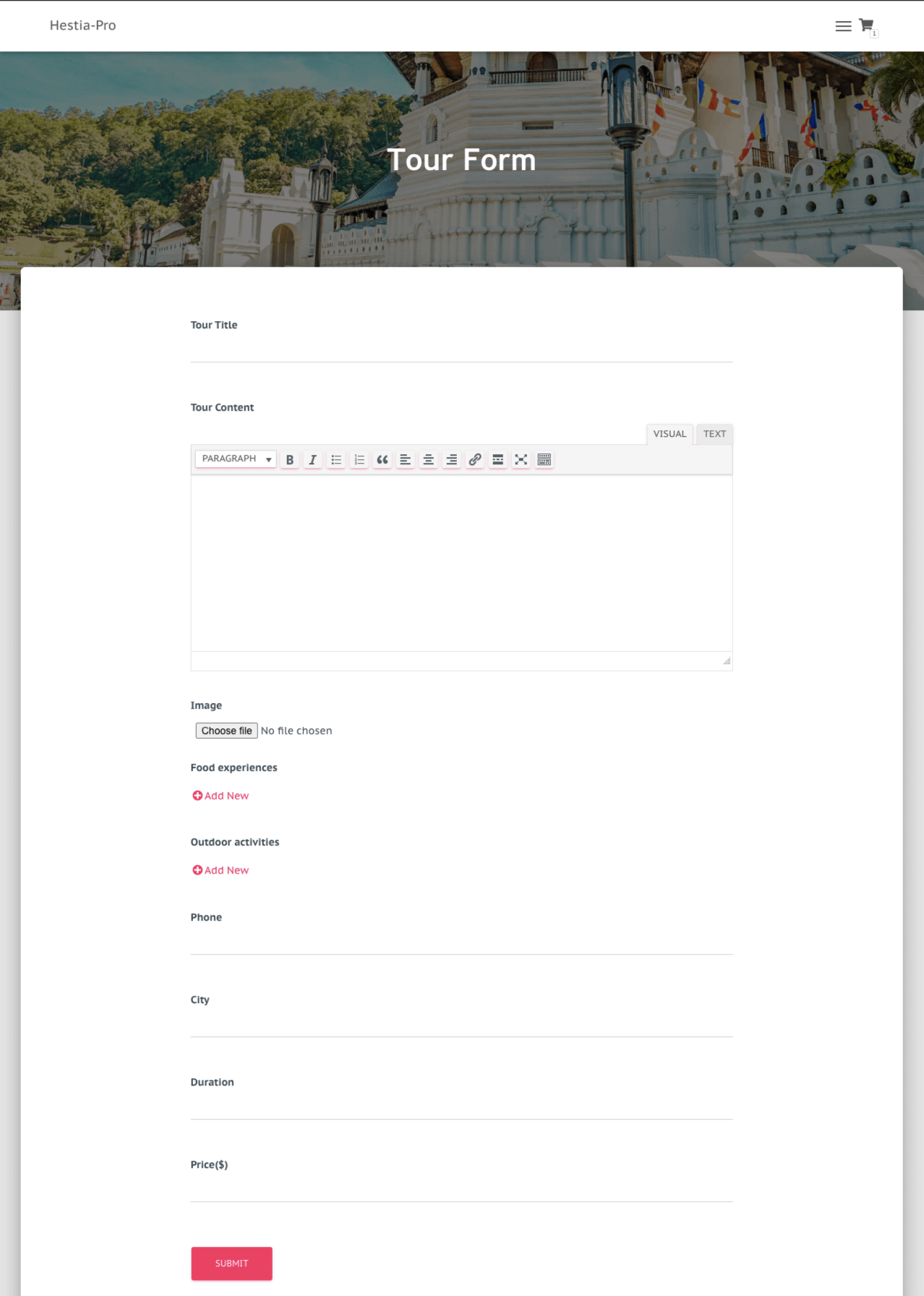The example travel website allows the user to submit travel/holiday destinations using a form on the front-end. Toolset helps you to automatically generate front-end forms. Based on the custom fields we created in out CPT “Tour” (Tour Name, Tour Description, City, Max number of participants, etc), Toolset Forms automatically a front-end form.