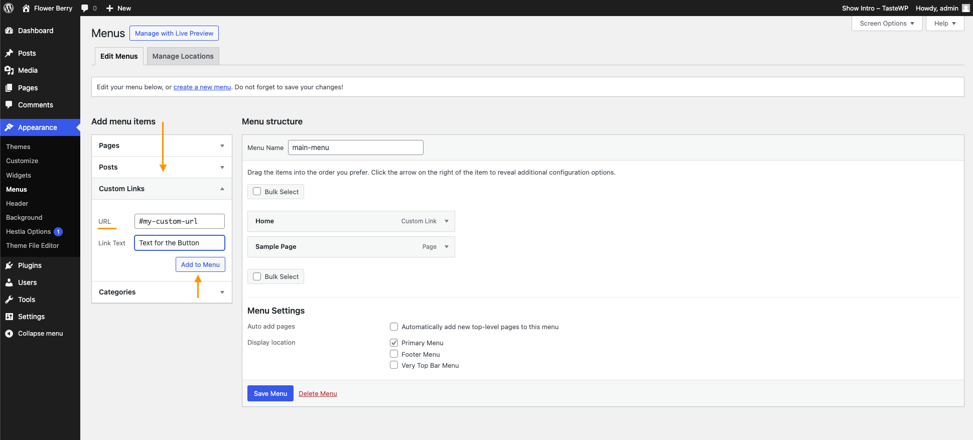 2 Inside the Primary Menu, add a new Custom Link item with URL and Label that will apply to the button.