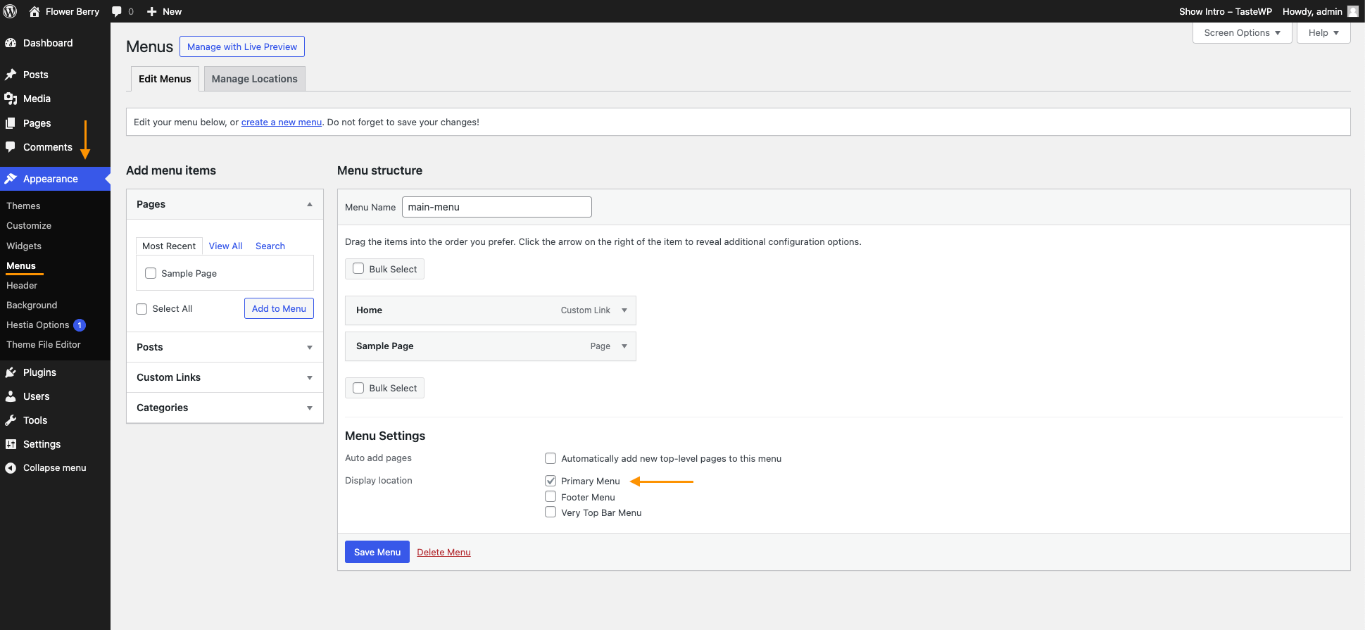 1 Navigate to Appearance > Menus > and make sure you are editing the Primary Menu.