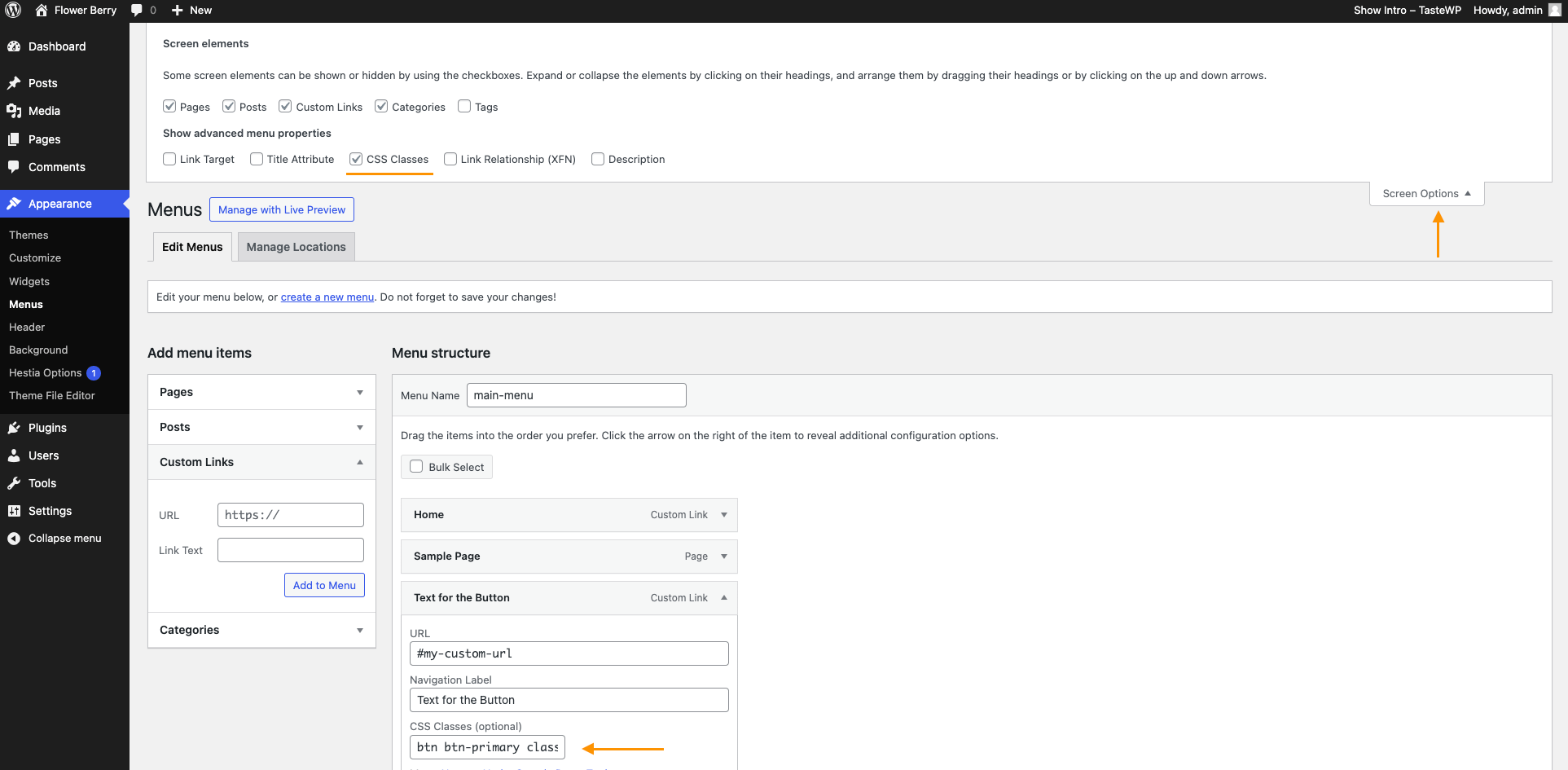 Note: keep in mind that by default the CSS Classes field it's not visible. To enable it, please open the Screen Options in the upper right corner and enable CSS Classes.