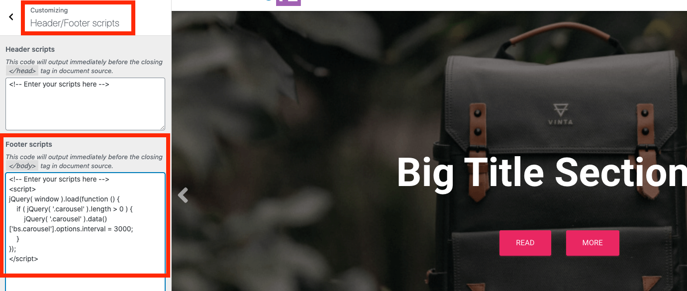 📝Note: For adding the above code just on the front page, navigate to Dashboard > Pages, edit the page assigned as the front page and use the Footer scripts field - screenshot.