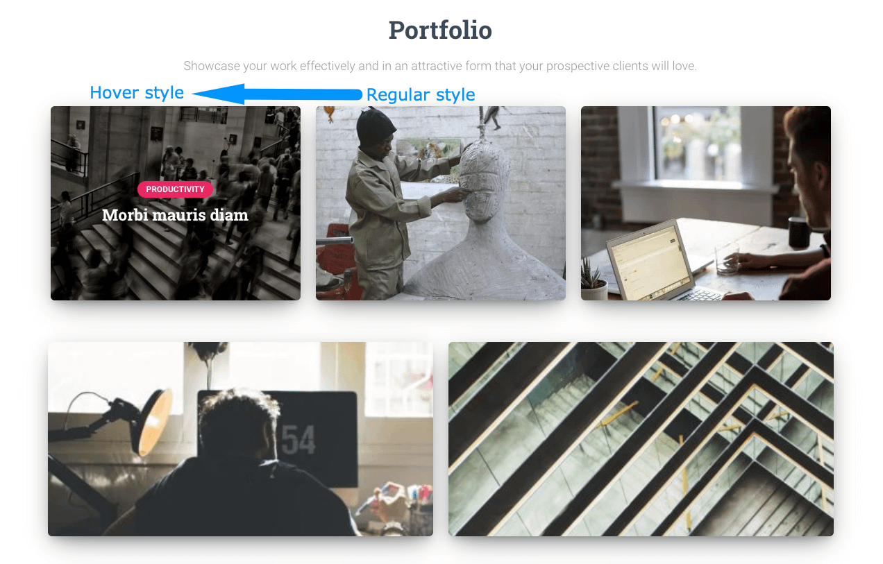 The portfolio section available on the front page of Hestia Pro, shows the project title and category only when hovering over it.