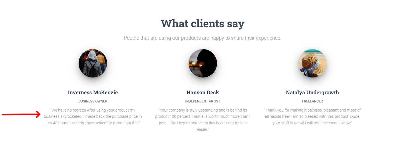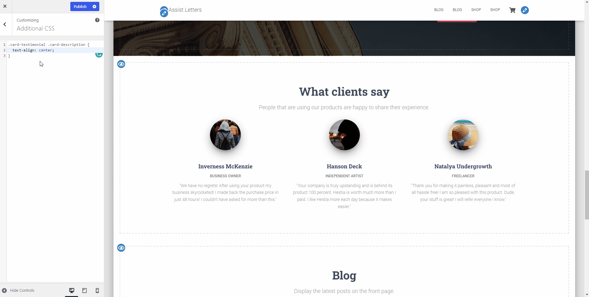 To change the testimonials text alignment in Hestia, please navigate to Appearance > Customize > Additional CSS section and add the following code: