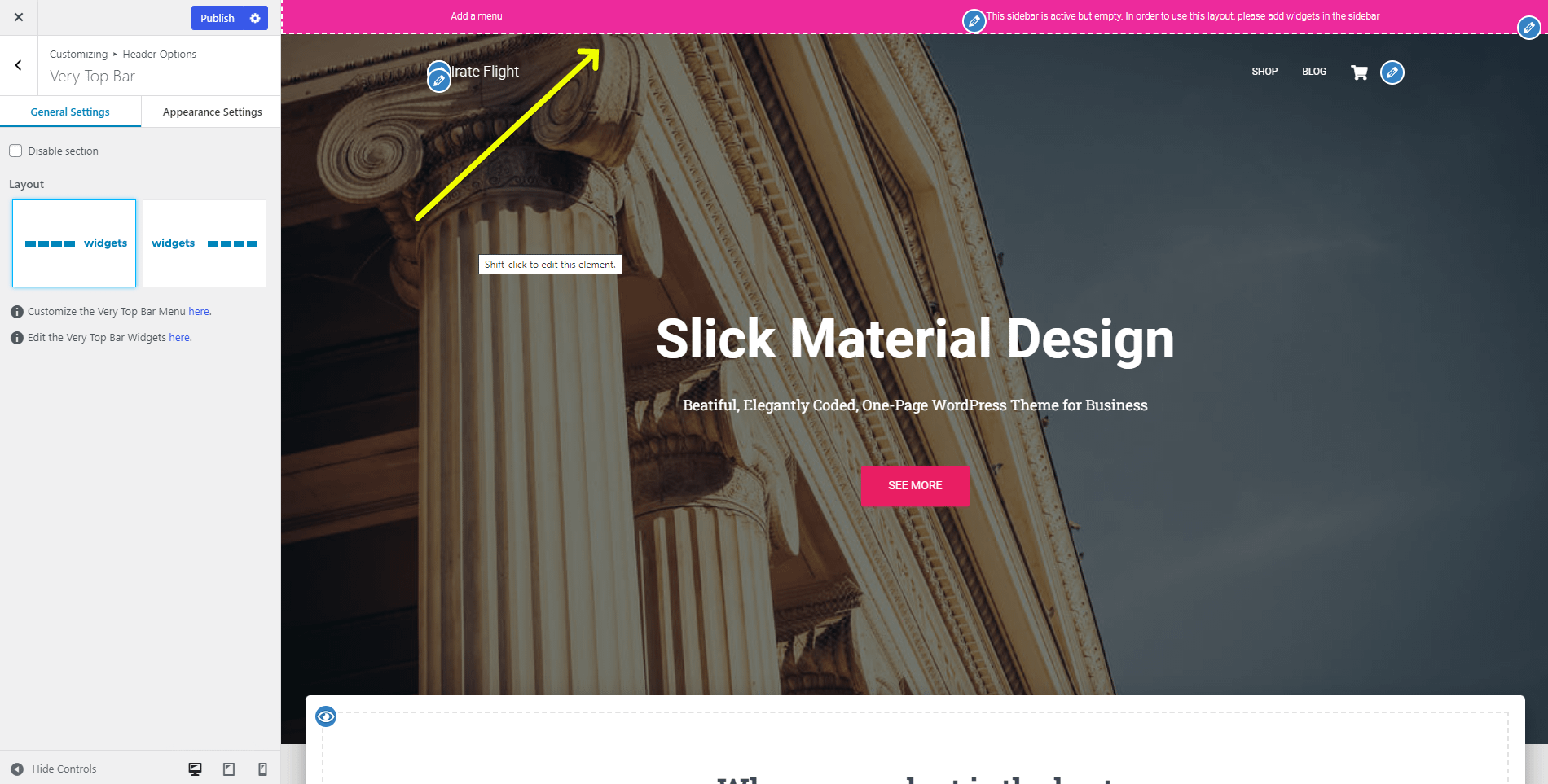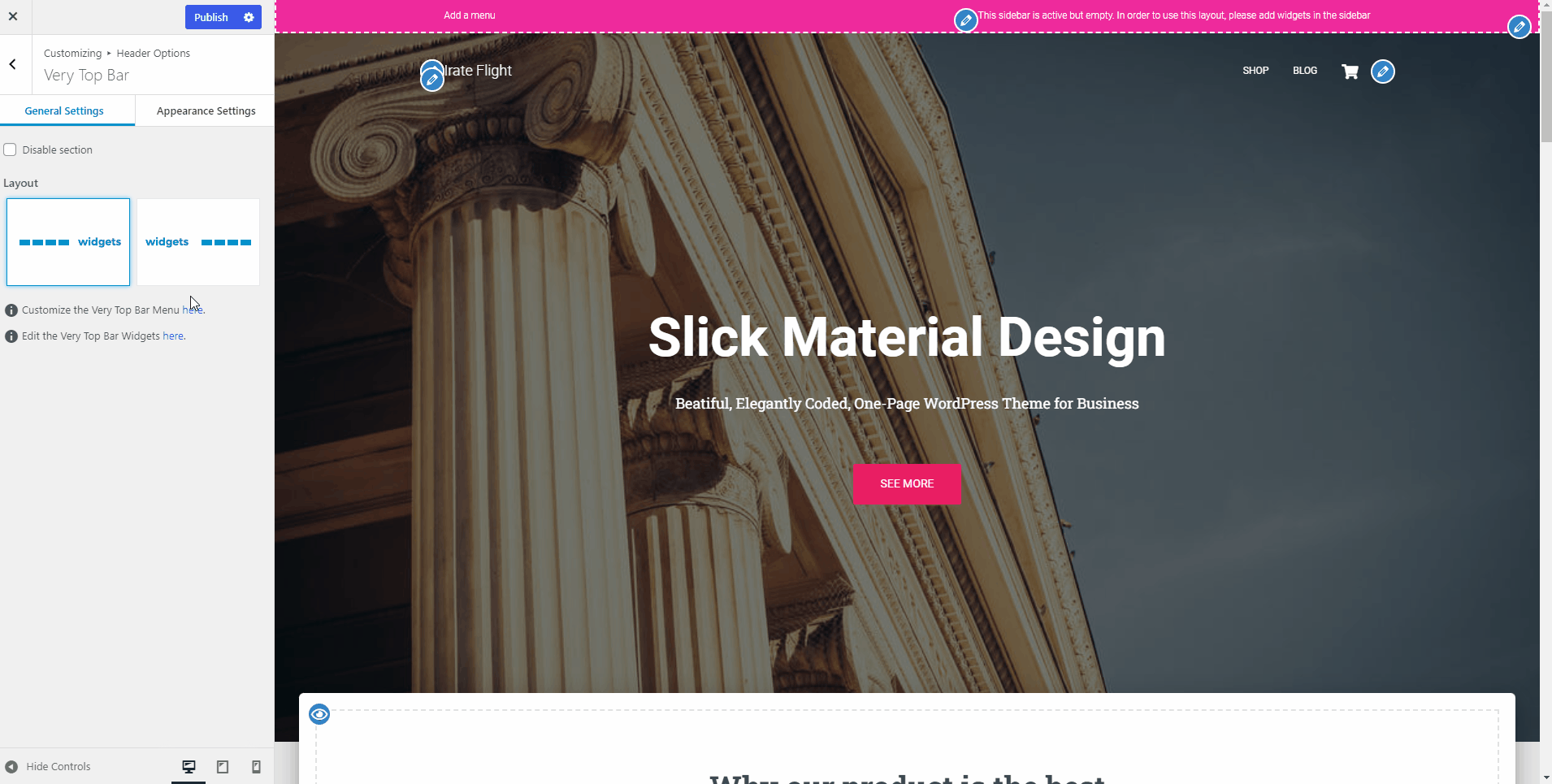 The Very Top Bar is the highest-positioned section on the site, just above the navigation area. It is divided into two panels: General Settings and Appearance Settings.