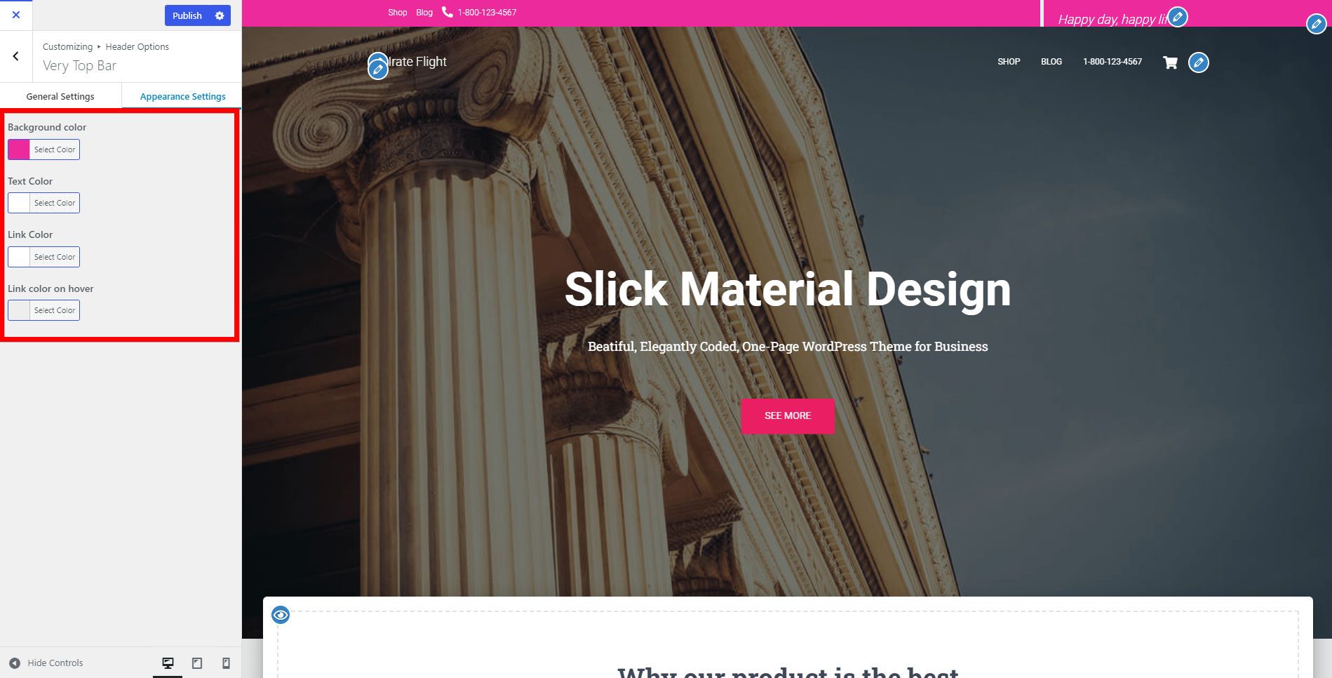 In Header Options > Very Top Bar > Appearance Settings, you can also change the background color of the entire section, as well as the colors of the text and links.
