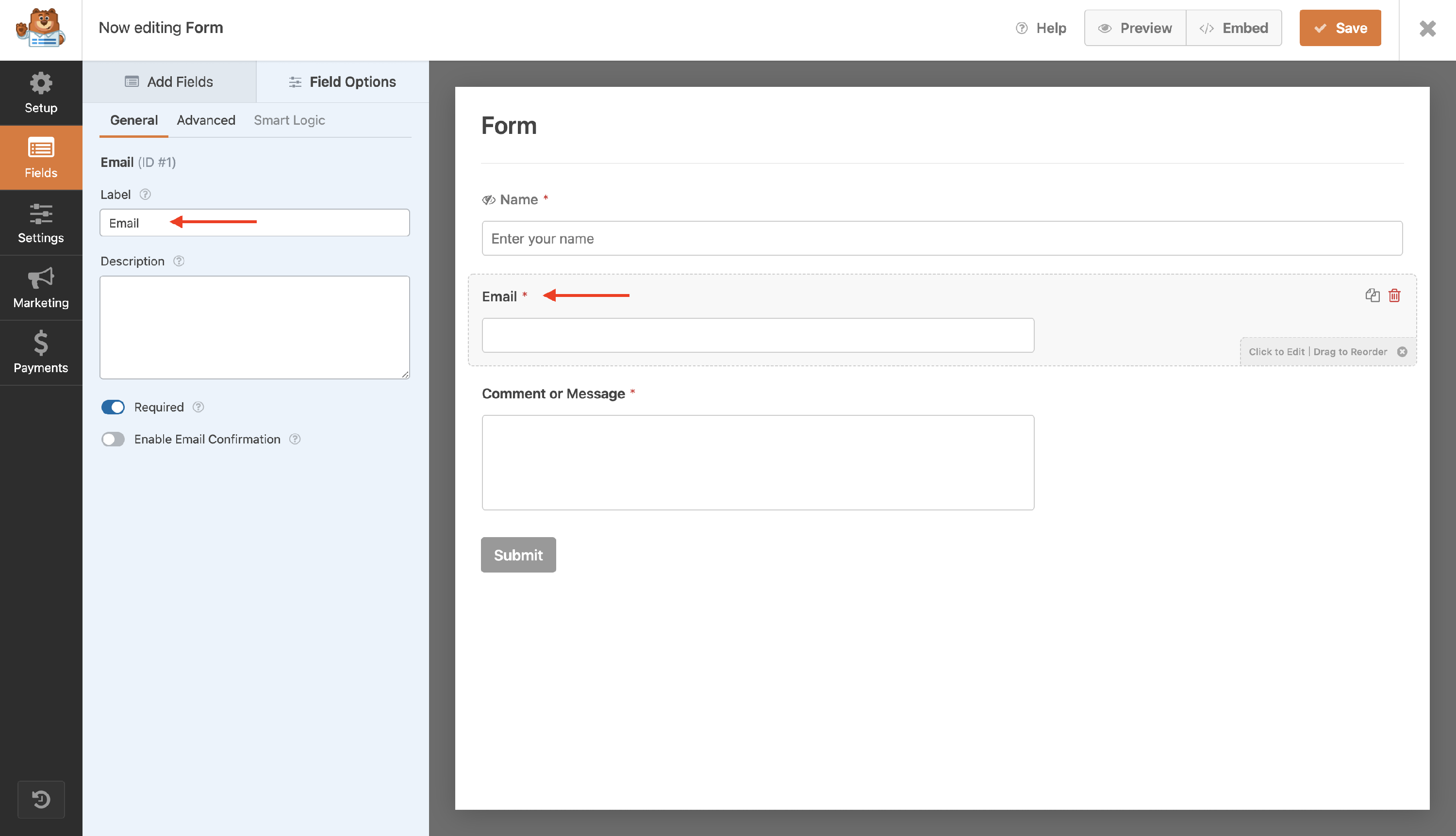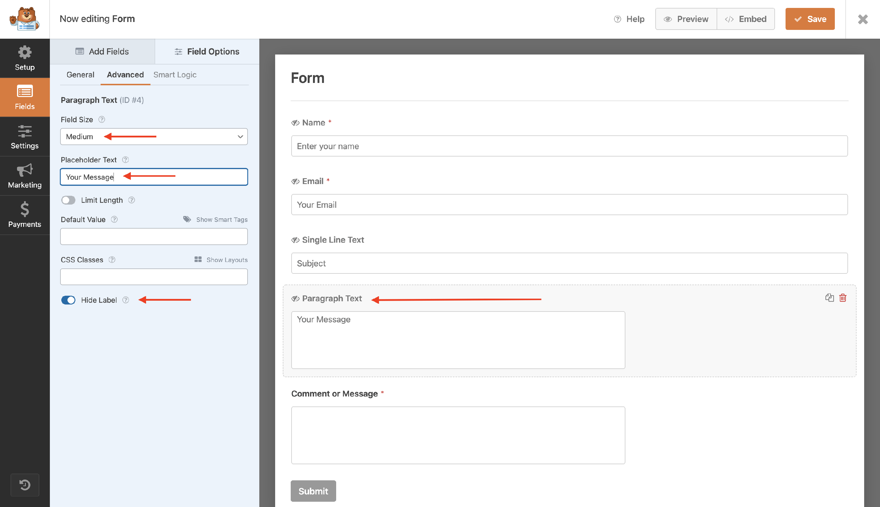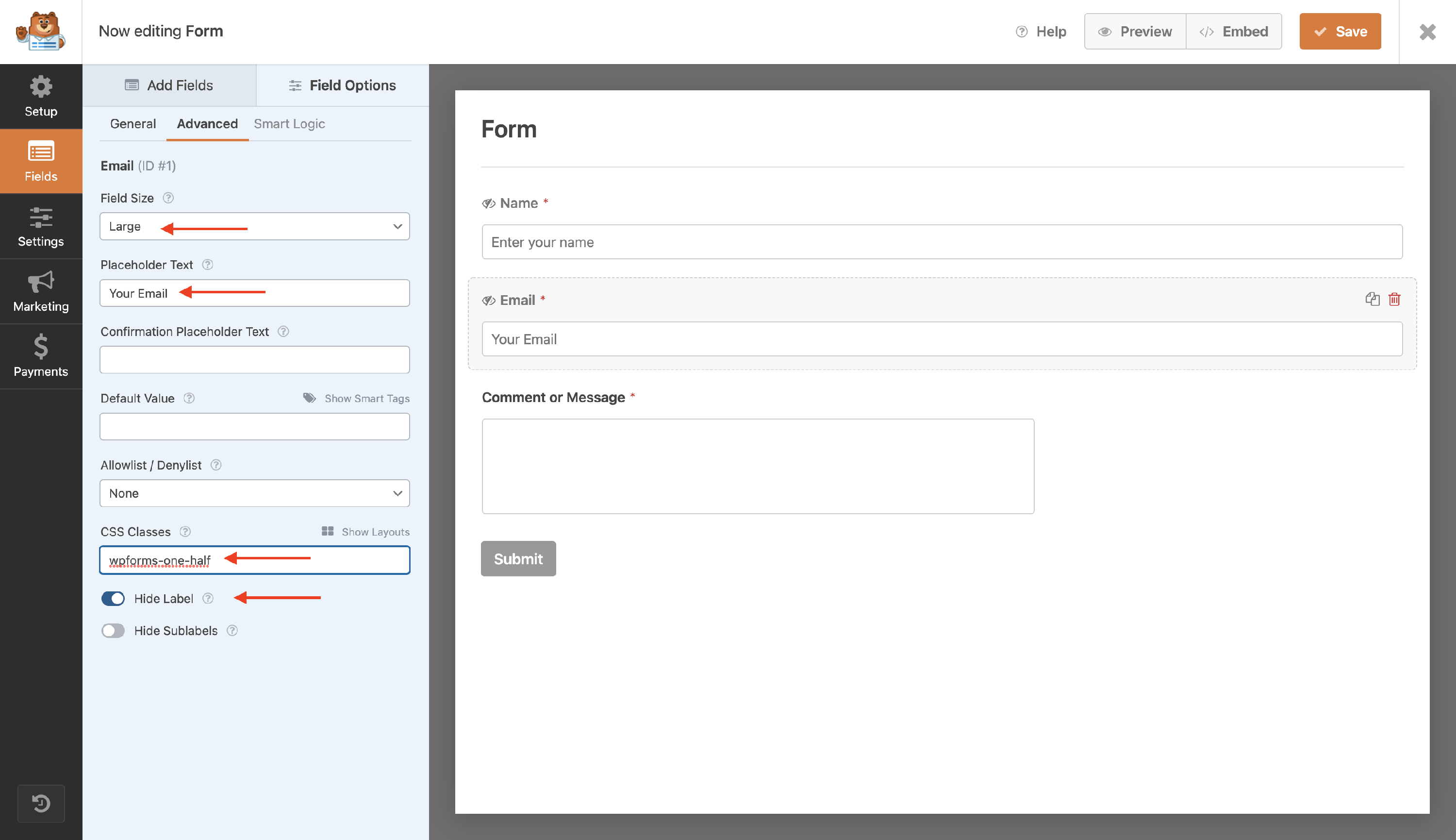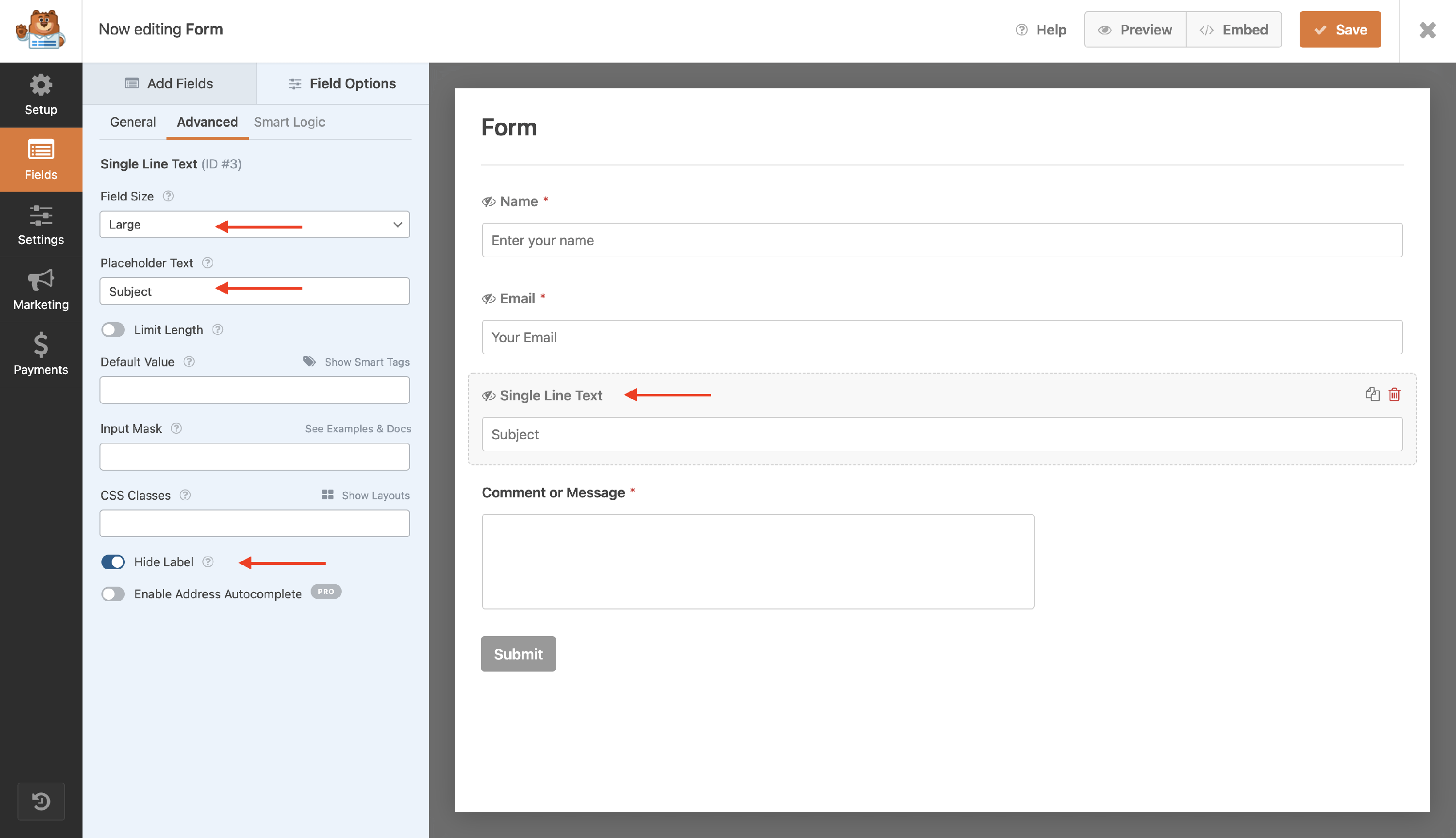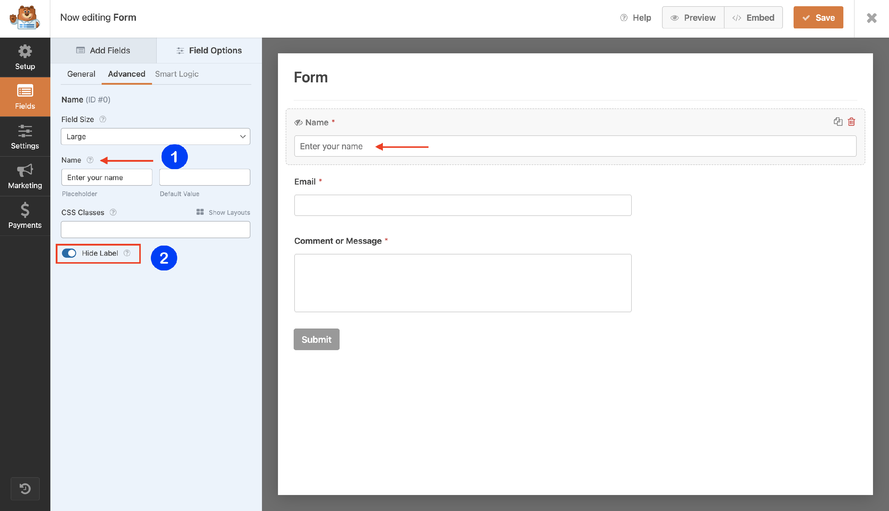 - Introduce a specific placeholder for the Name field ( such as Enter your name ) and enable the Hide Label option.