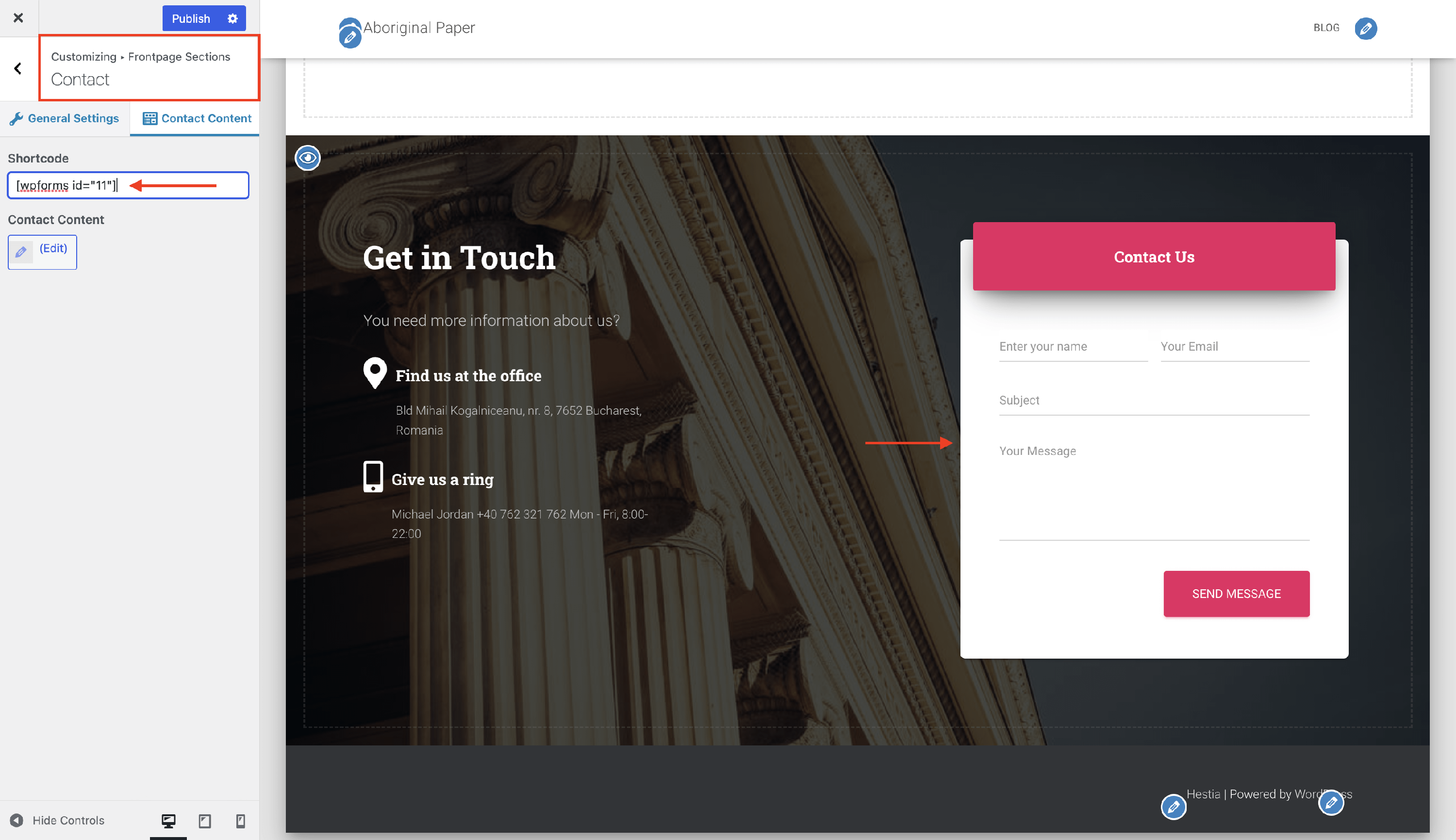 2 Navigate to the Customizer > Frontpage sections > Contact > Contact Content. There, paste your code in the " Shortcode" input, click Publish and you're all set.