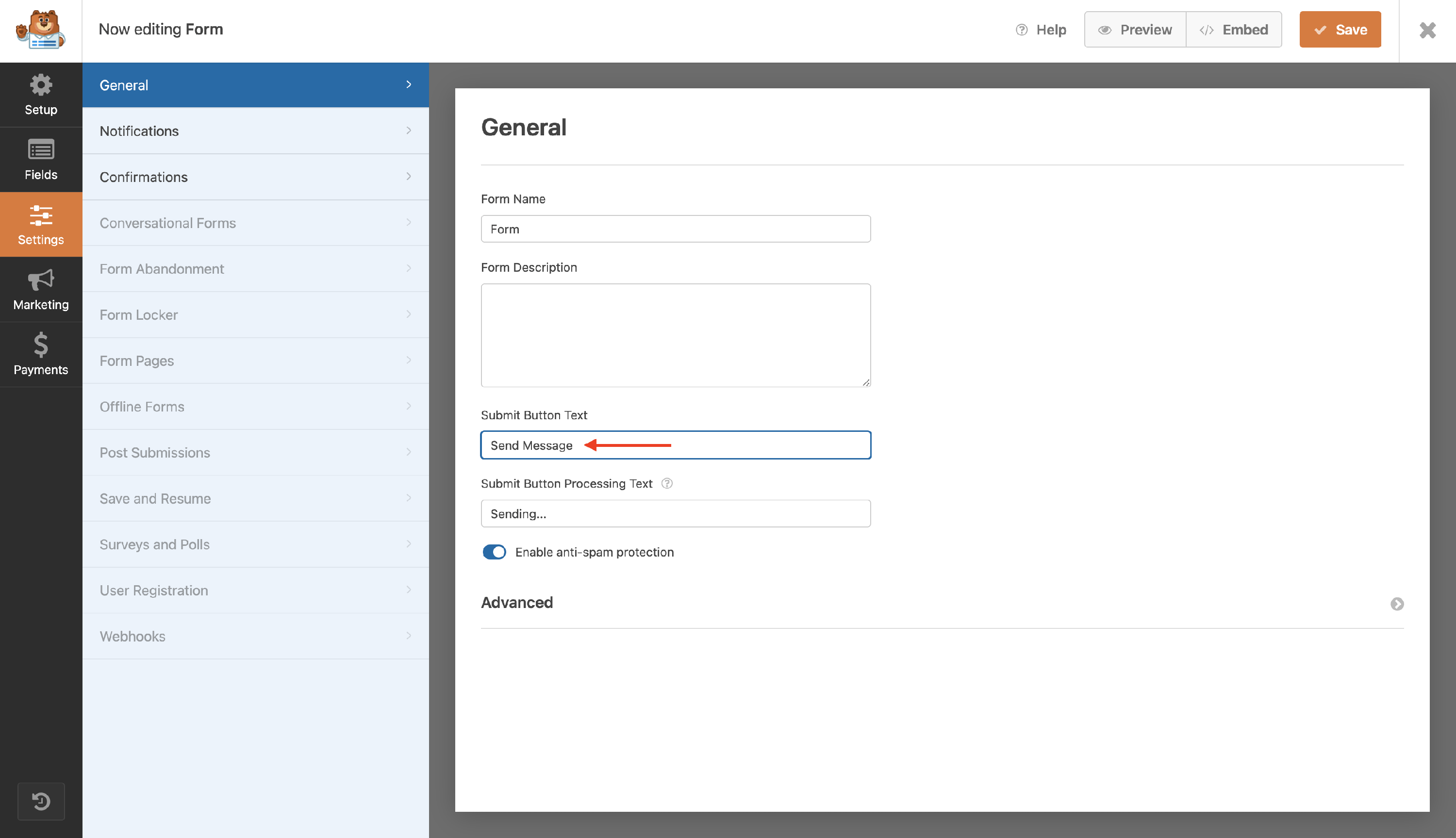 - Click on the Submit button or go to the Settings tab, and change the Submit Button Text to Send Message.