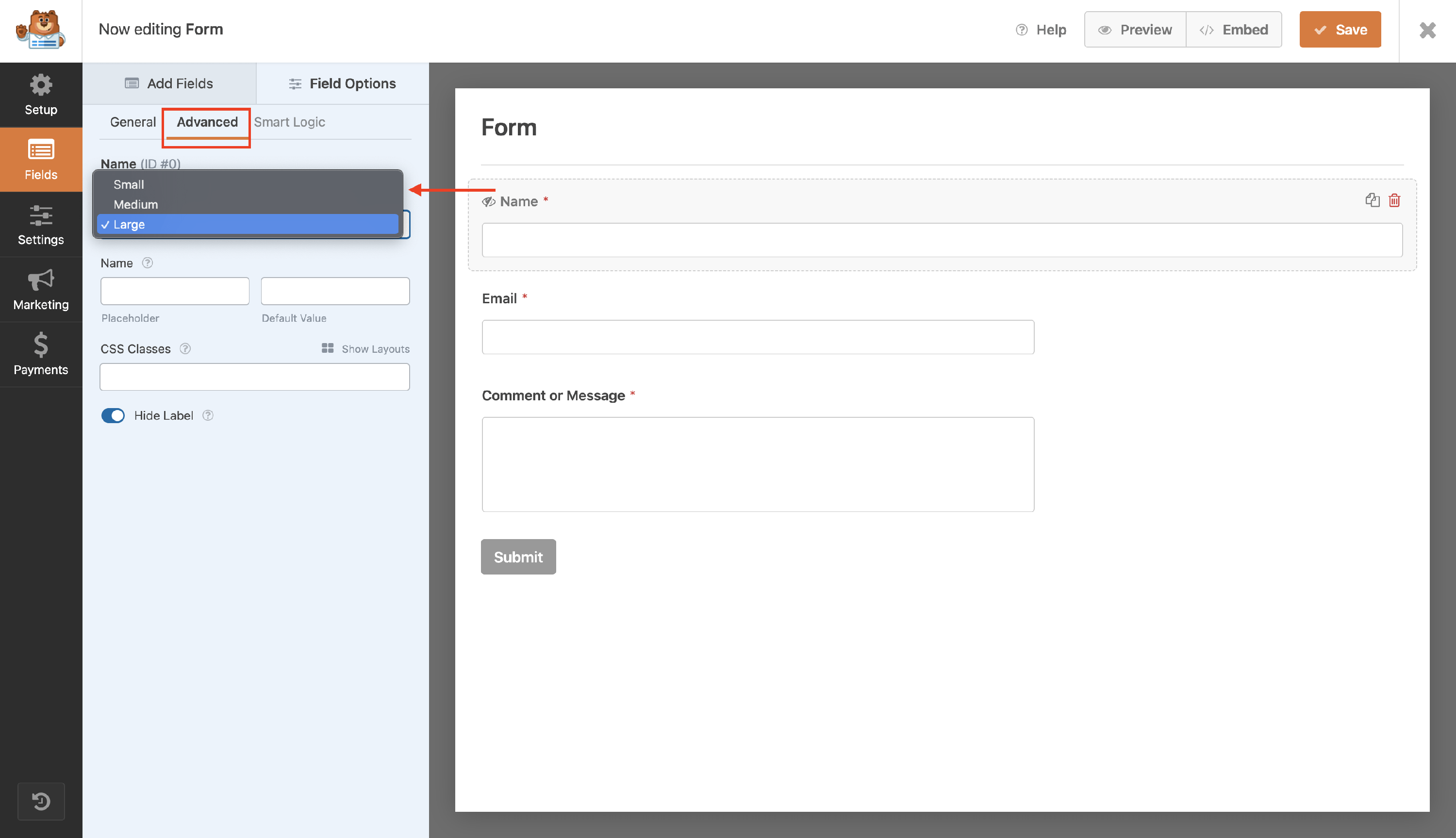 - Click on the Advanced tab and open the Field Size dropdown. Select the Large option.
