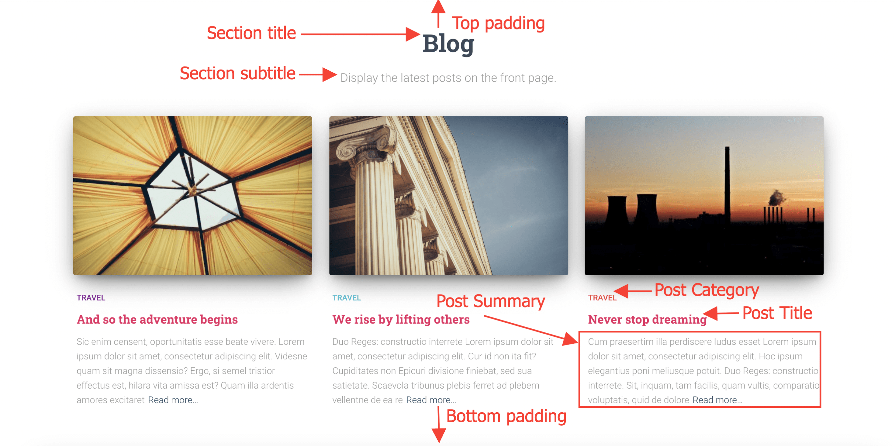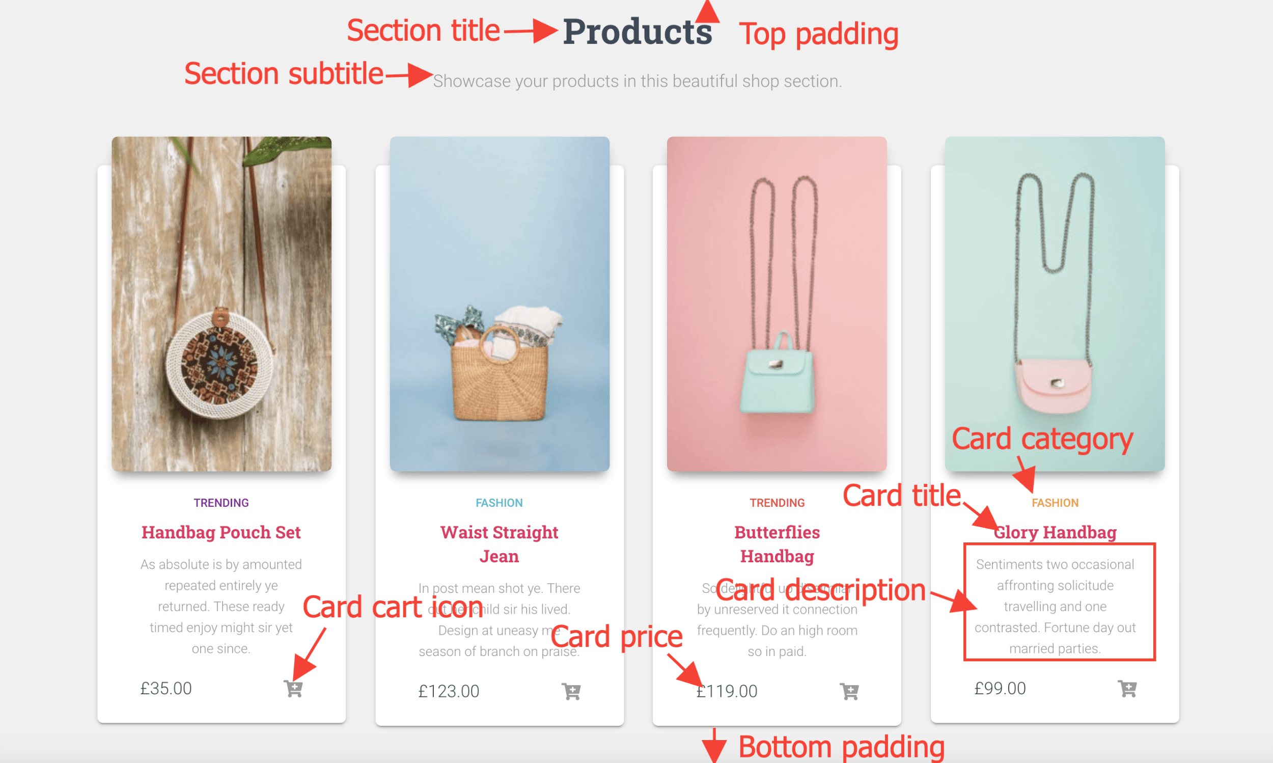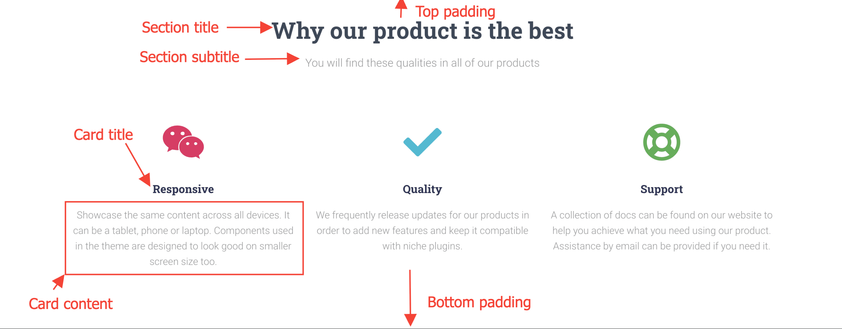 These are some of the CSS properties that can be used to customize elements in the theme. In the next chapters of this document, you can find the appropriate selectors to target each section.