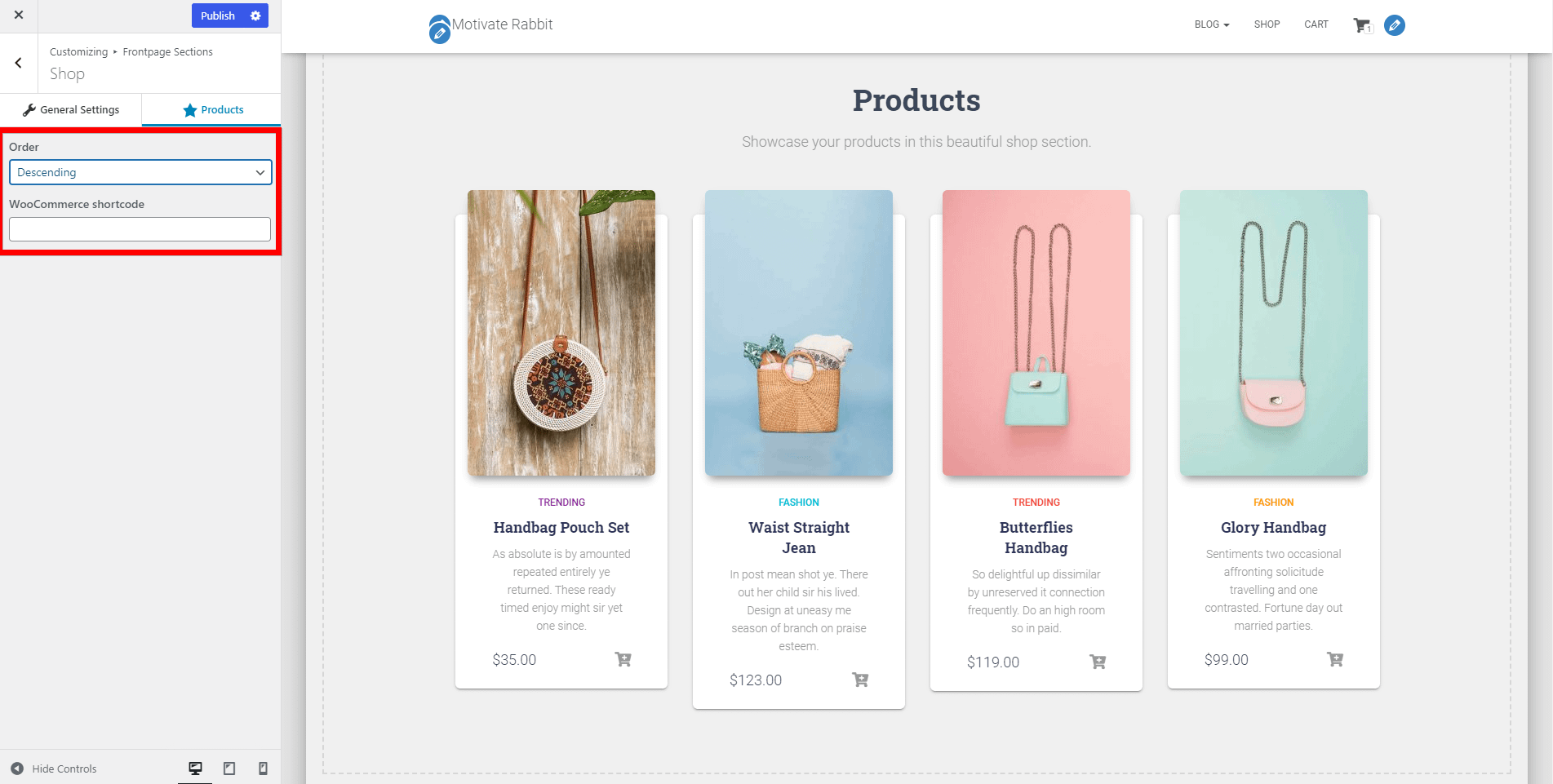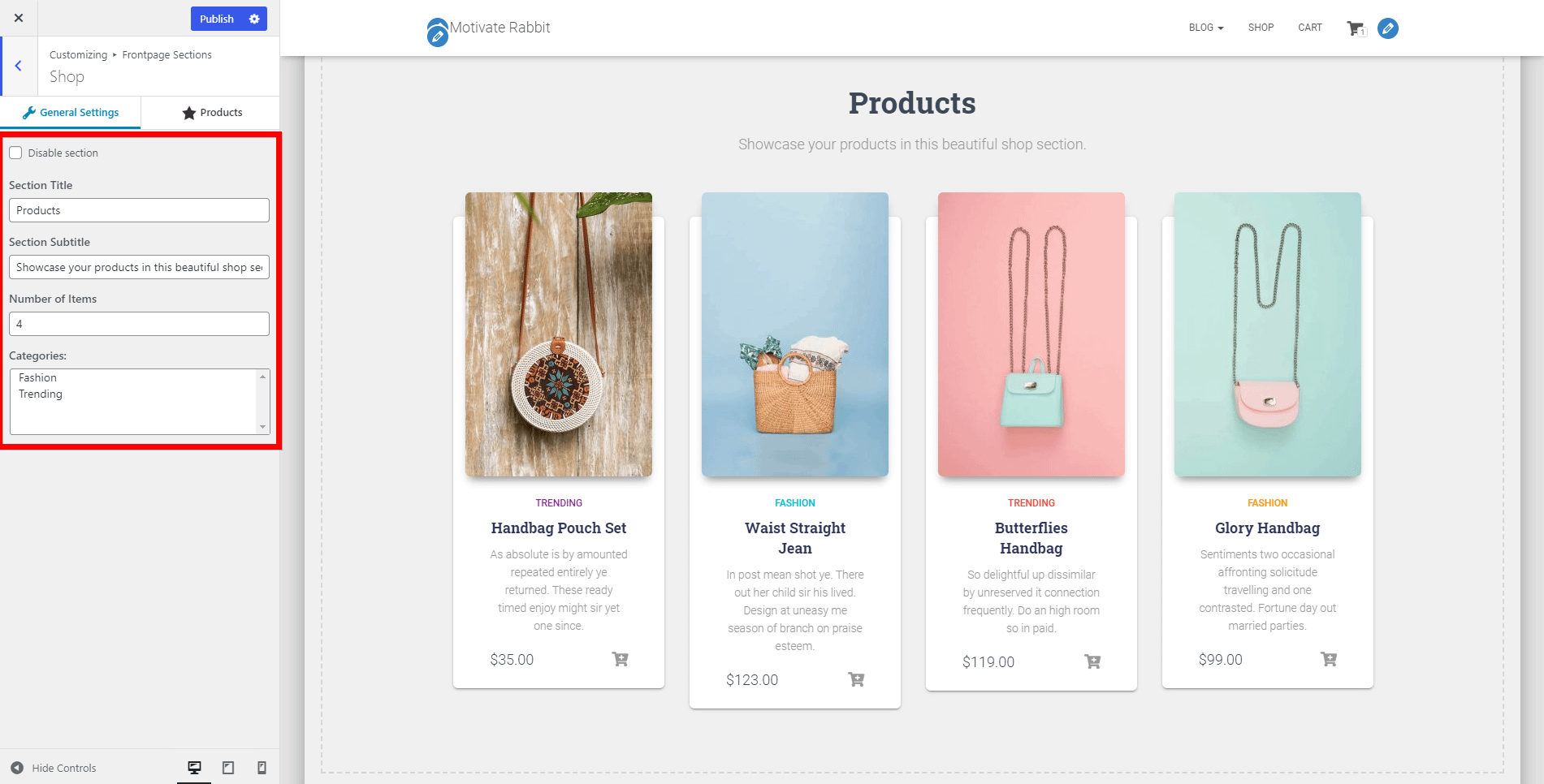 - Number of Items - allows you to change the number of products displayed in the Shop Section.