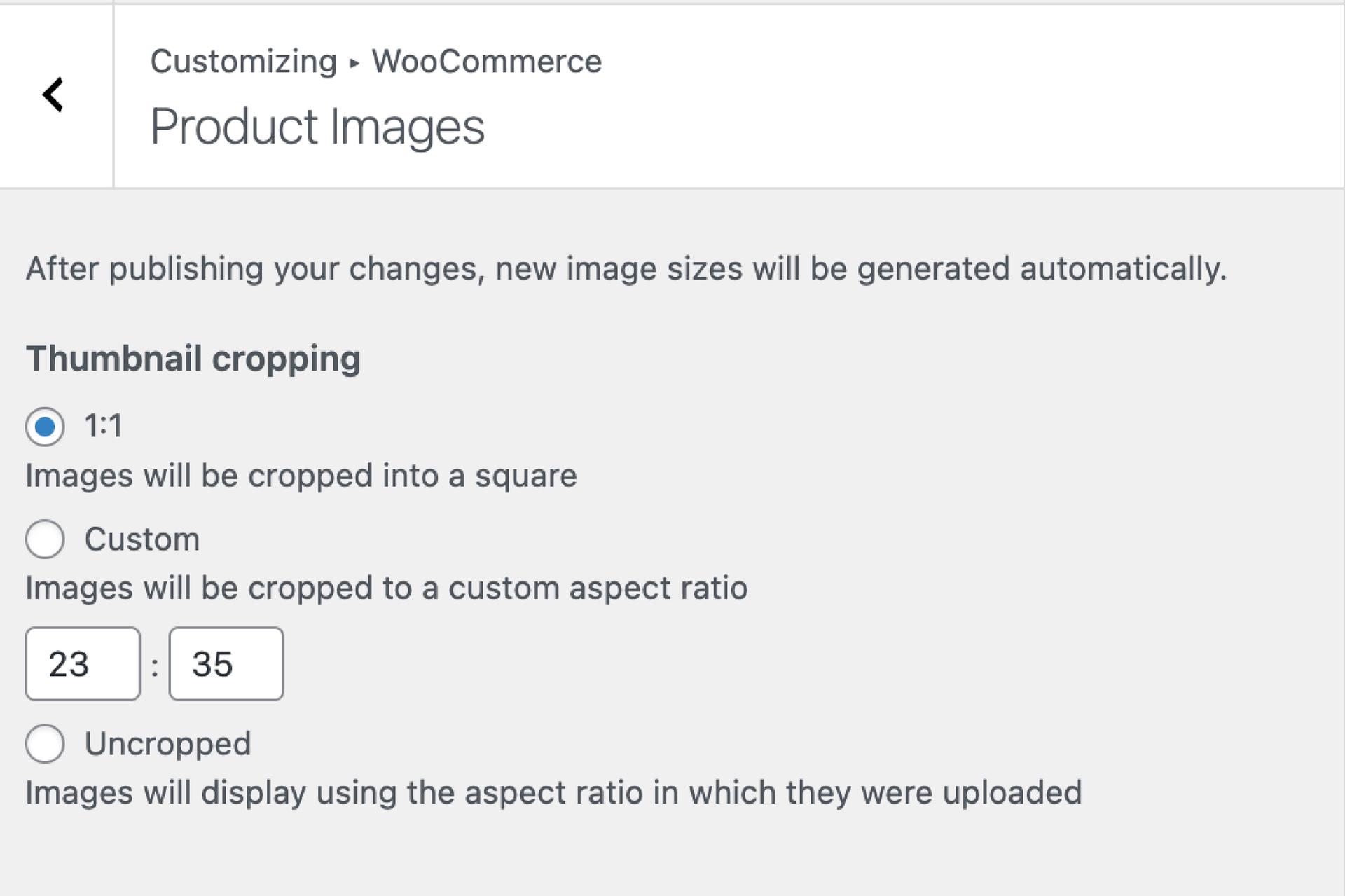 📝 Note: If you choose Uncropped, images display at the aspect ratio they were uploaded with, which will produce uneven thumbnails if your product photos have different dimensions.