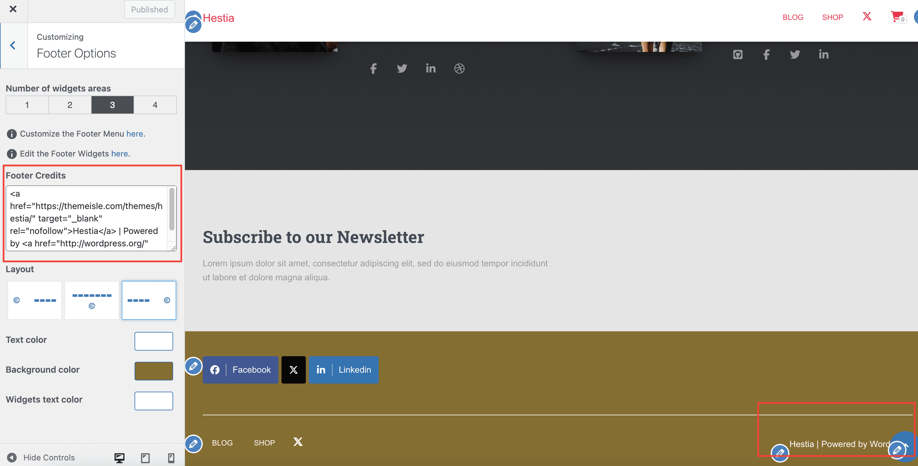 📝 Note: The following steps are available in the premium version of Hestia, which you can get from here. The free version does not provide customizations for footer copyrights.