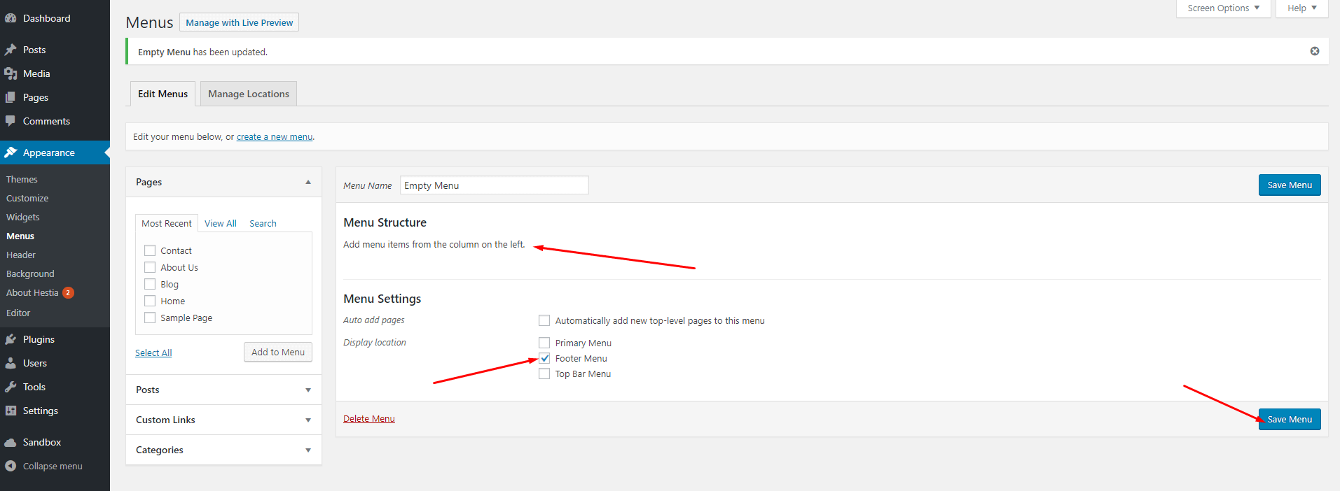 Add some pages to show them in the footer or let the menu empty if you don't want to show anything in the footer. Now assign it the Footer Menu location. Click Save Menu.
