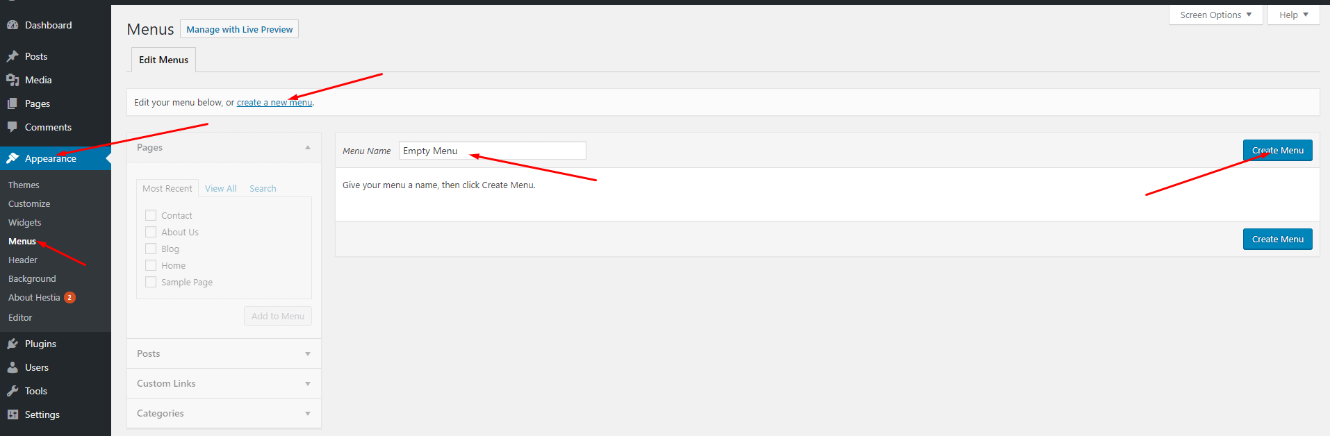 Navigate from your Dashboard to Appearance Menus. Here click on create a new menu and name it as you wish, in this example we will call it Empty Menu. Then click Create Menu.