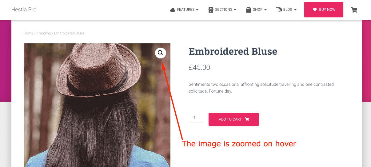 The product thumbnail in the Hestia theme is zoomed when the user hovers over the image.