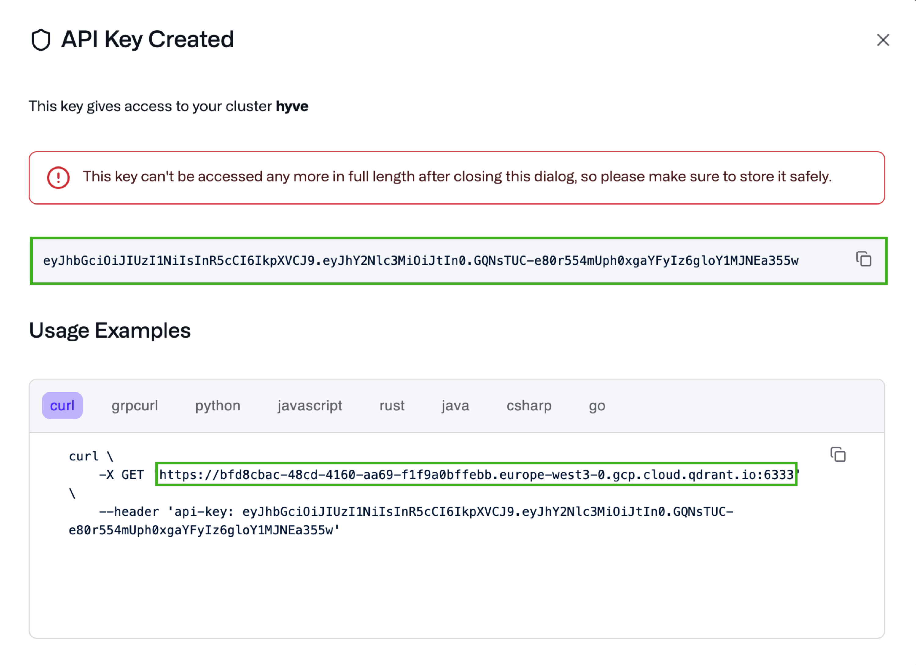 https://bfd8cbac-48cd-4160-aa69-f1f9a0bffebb.europe-west3-0.gcp.cloud.qdrant.io:6333You can use