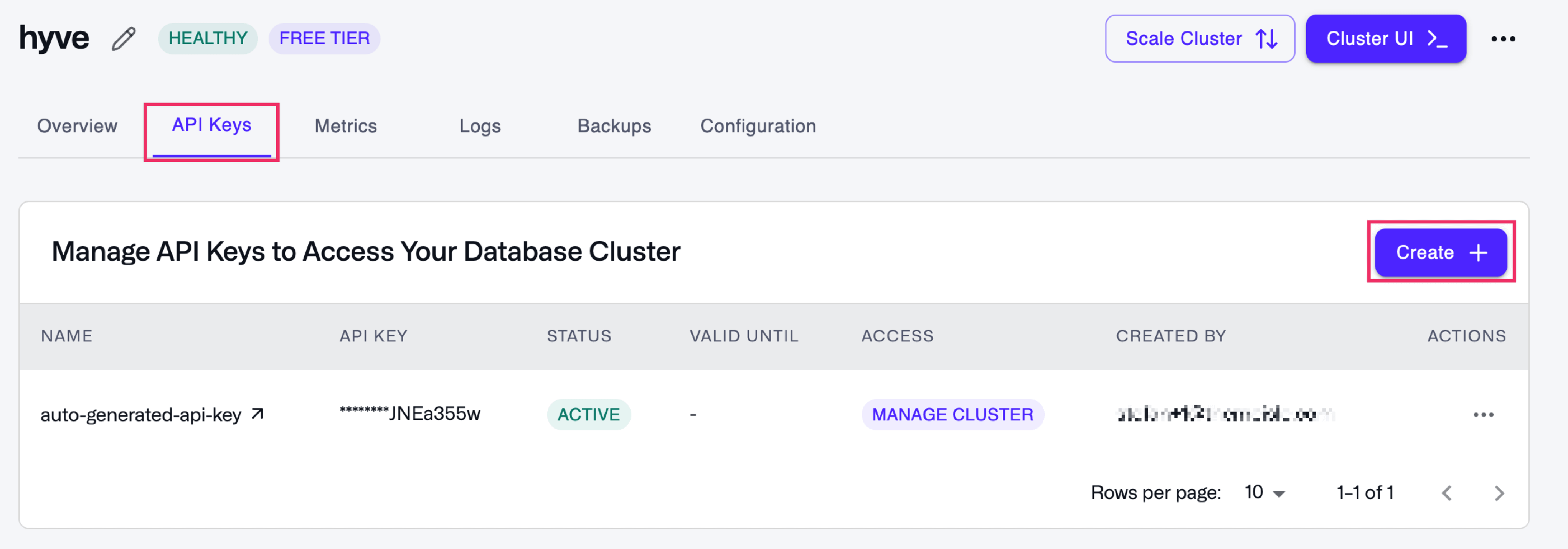 To create a new API Key, navigate to the API Keys tab on your cluster and choose Create.