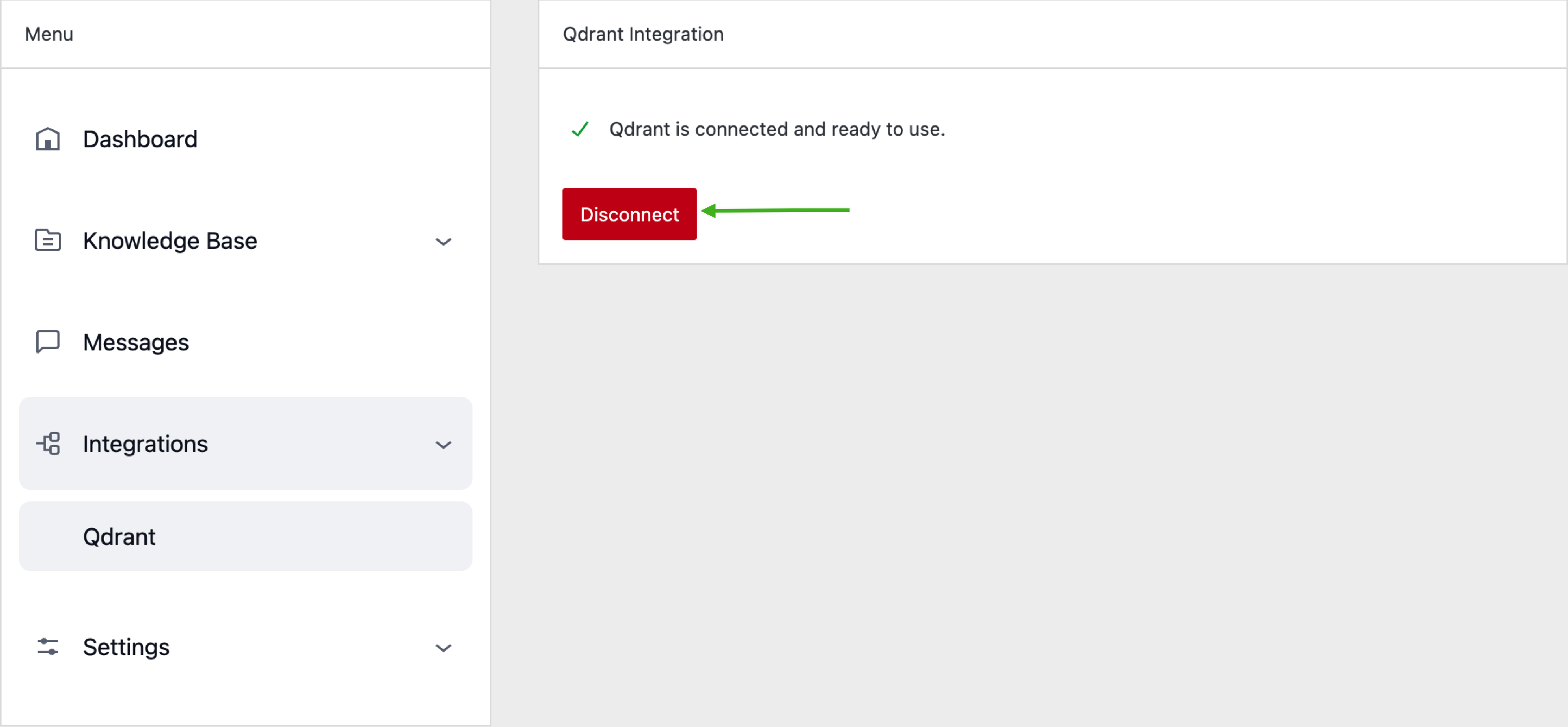 https://bfd8cbac-48cd-4160-aa69-f1f9a0bffebb.europe-west3-0.gcp.cloud.qdrant.ioClick Connect, and your Knowledge Base content will be migrated to Qdrant.