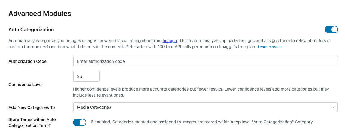 Paste the Authorization code in to the Setting's Imagga: Authorization Code field within your WordPress installation.