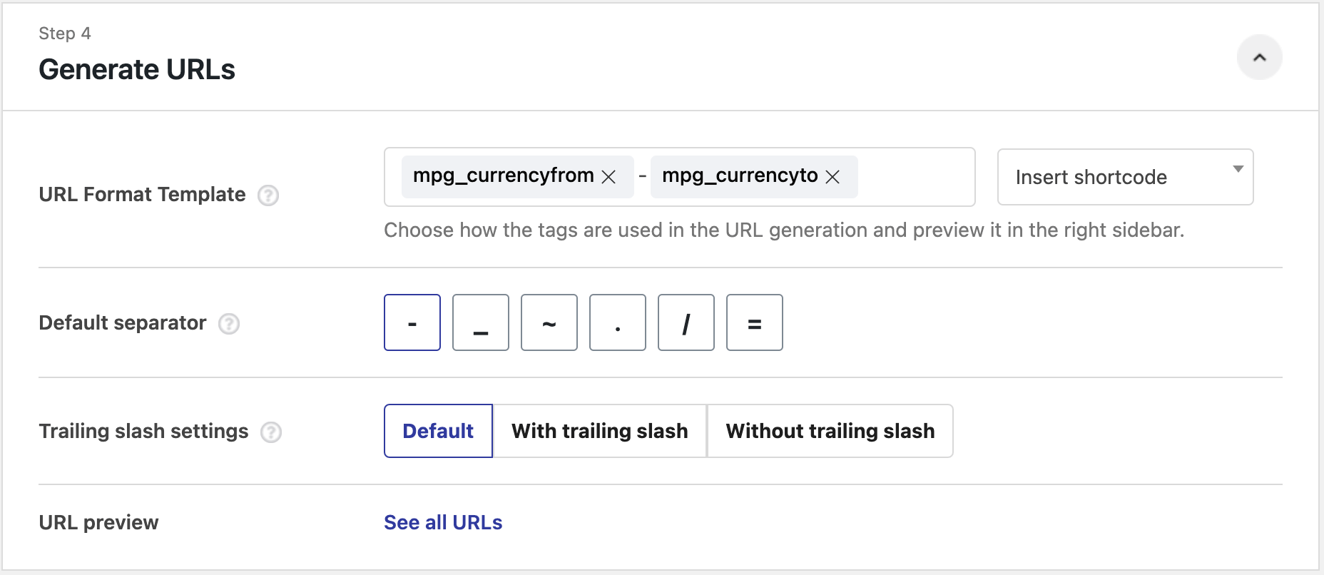 4Generate URLs: Set URL Format Template using shortcodes: mpg_currencyfrom and mpg_currencyto to create URLs like /usd-eur/.