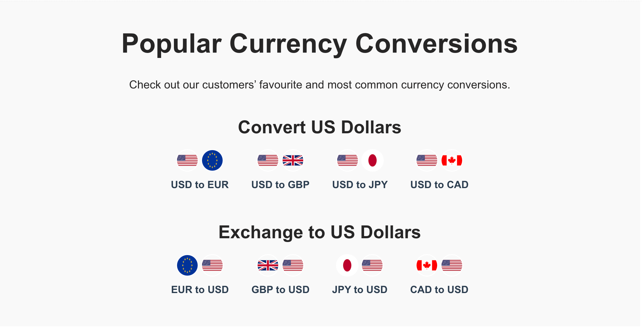 <section> <div> <h1>Popular Currency Conversions</h1> <p>Check out our customers’ favourite and most common currency conversions.</p> <!-- Convert US Dollars Section --> <h2>Convert US Dollars</h2> <div>[mpg project-id="2" limit="4" where="CurrencyFrom=USD"] <div> <a href="/{{mpg_currencyfrom}}-{{mpg_currencyto}}"><div><img src="{{mpg_currencyfromimg}}" alt="{{mpg_currencyfrom}}" /> <img src="{{mpg_currencytoimg}}" alt="{{mpg_currencyto}}" /></div> <span>USD to {{mpg_currencyto}}</span> </div></a> [/mpg]</div> </section>