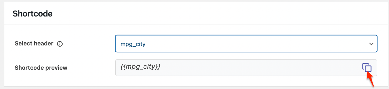 The typical format of an MPG shortcode is {{ mpg_COLUMN-NAME }}. You can also copy the generated shortcodes from the Template tab ( from the URL generation ), then switch to the ‘Shortcode’ tab.