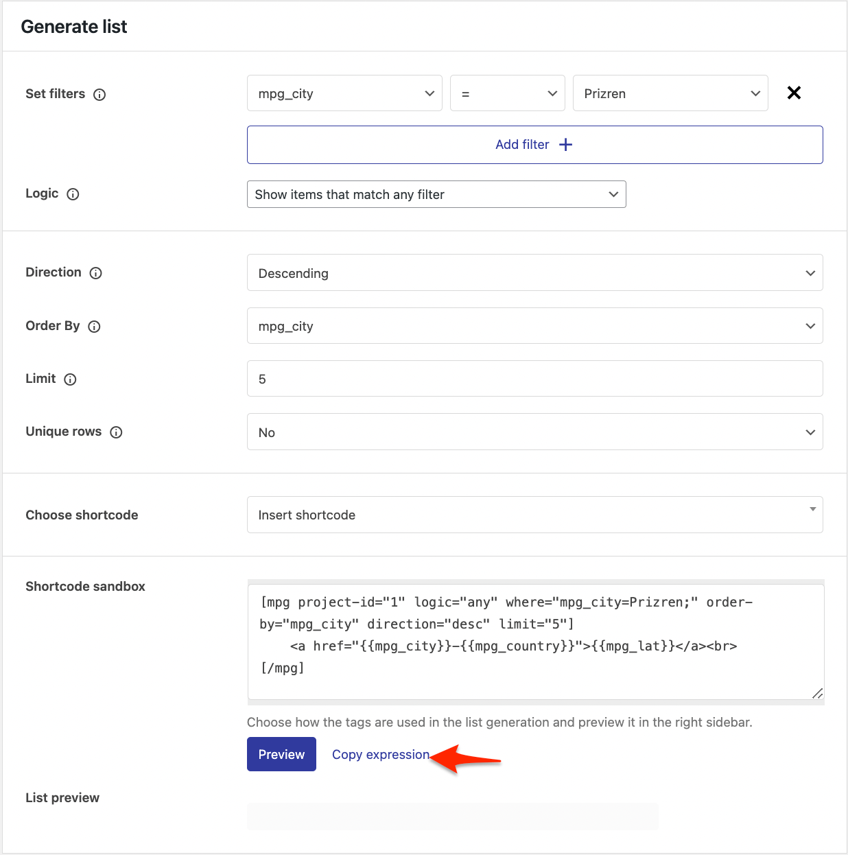 MPG allows you to insert lists from the Generate list tab and set conditions regarding the headers to control their visibility. Make sure you set a condition by choosing it from the dropdown list, then make the desired configuration ( set limits, display order, control uniqueness ). In the end, you can also add other shortcodes, then just copy the code from the sandbox and place it on the page.
