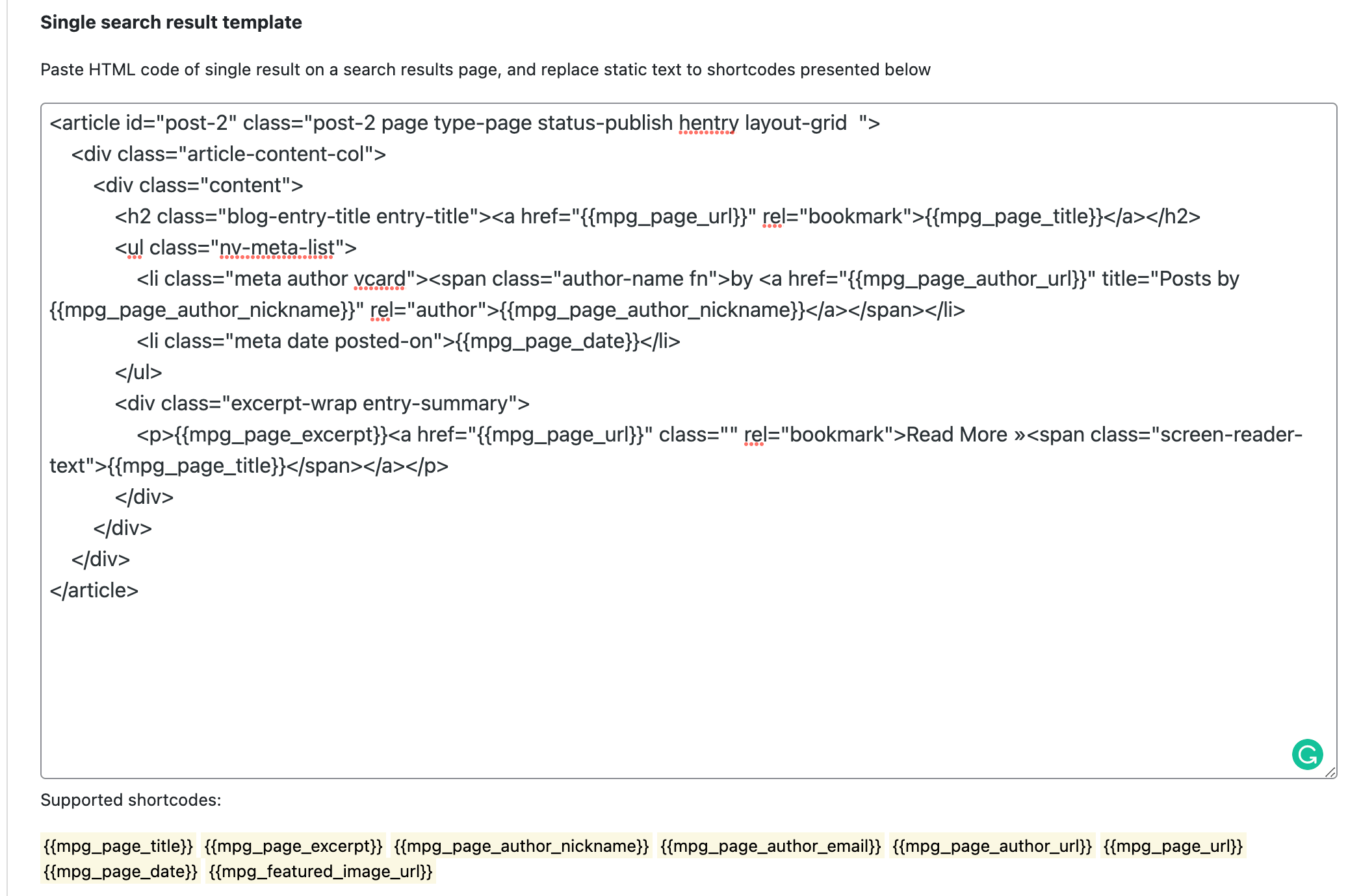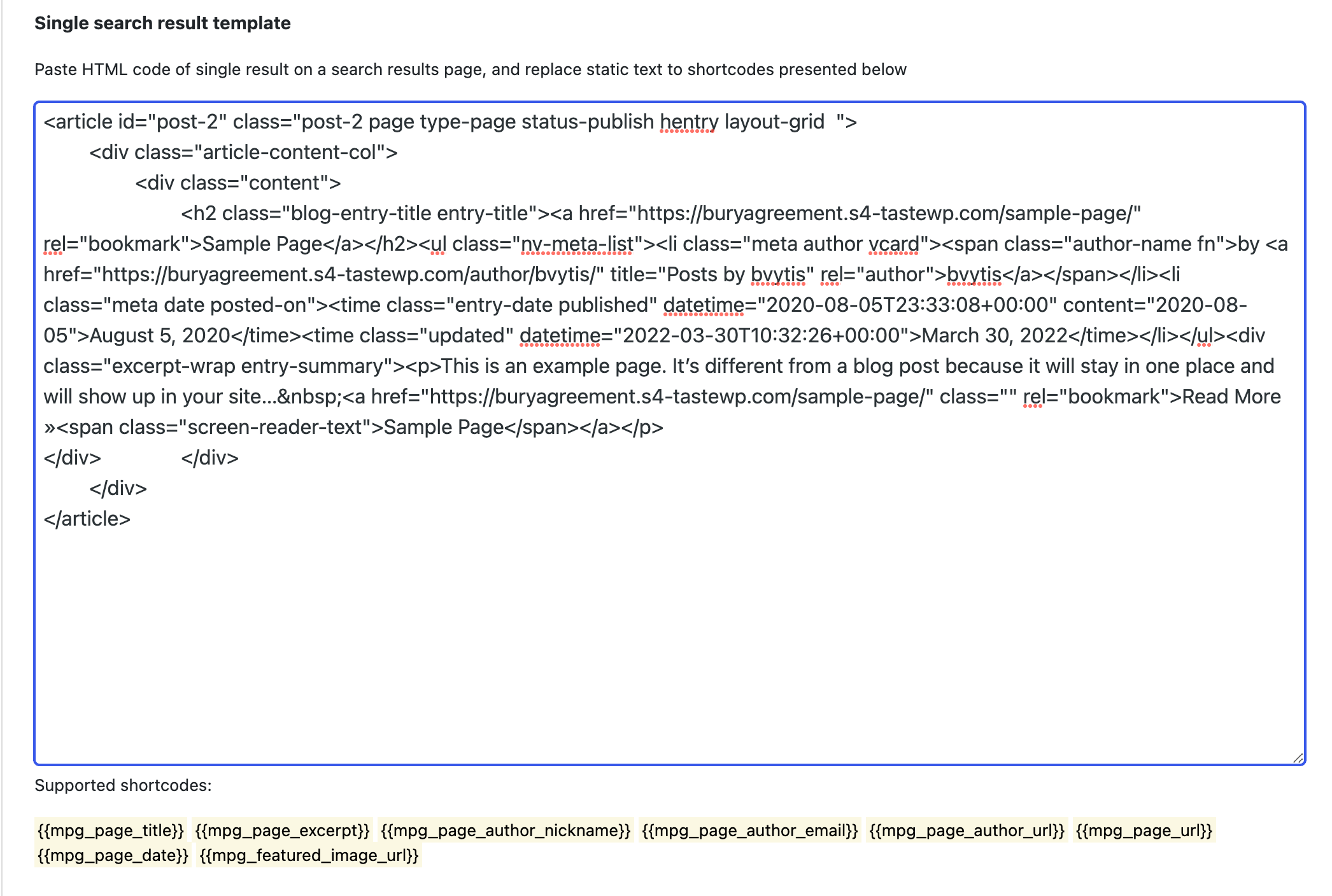 Now, the last thing to do is to replace all the text here with those shortcodes that we have highlighted in yellow below the text area. It's not necessary to use all of them, use only those that make sense to you and that match the structure of your current search page.